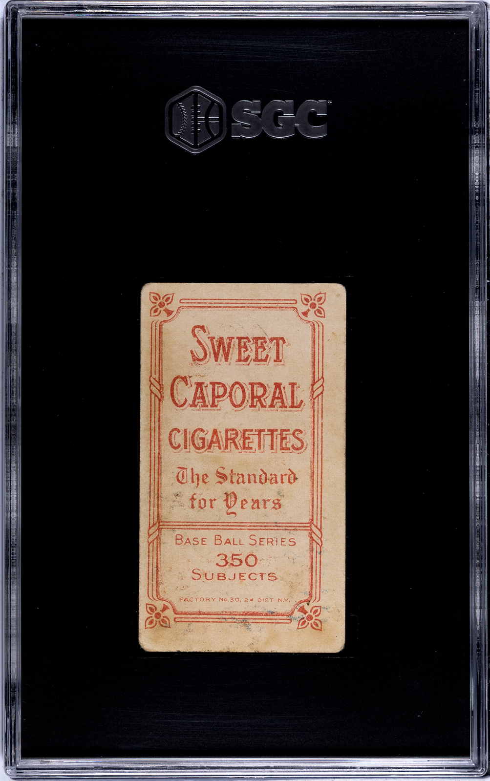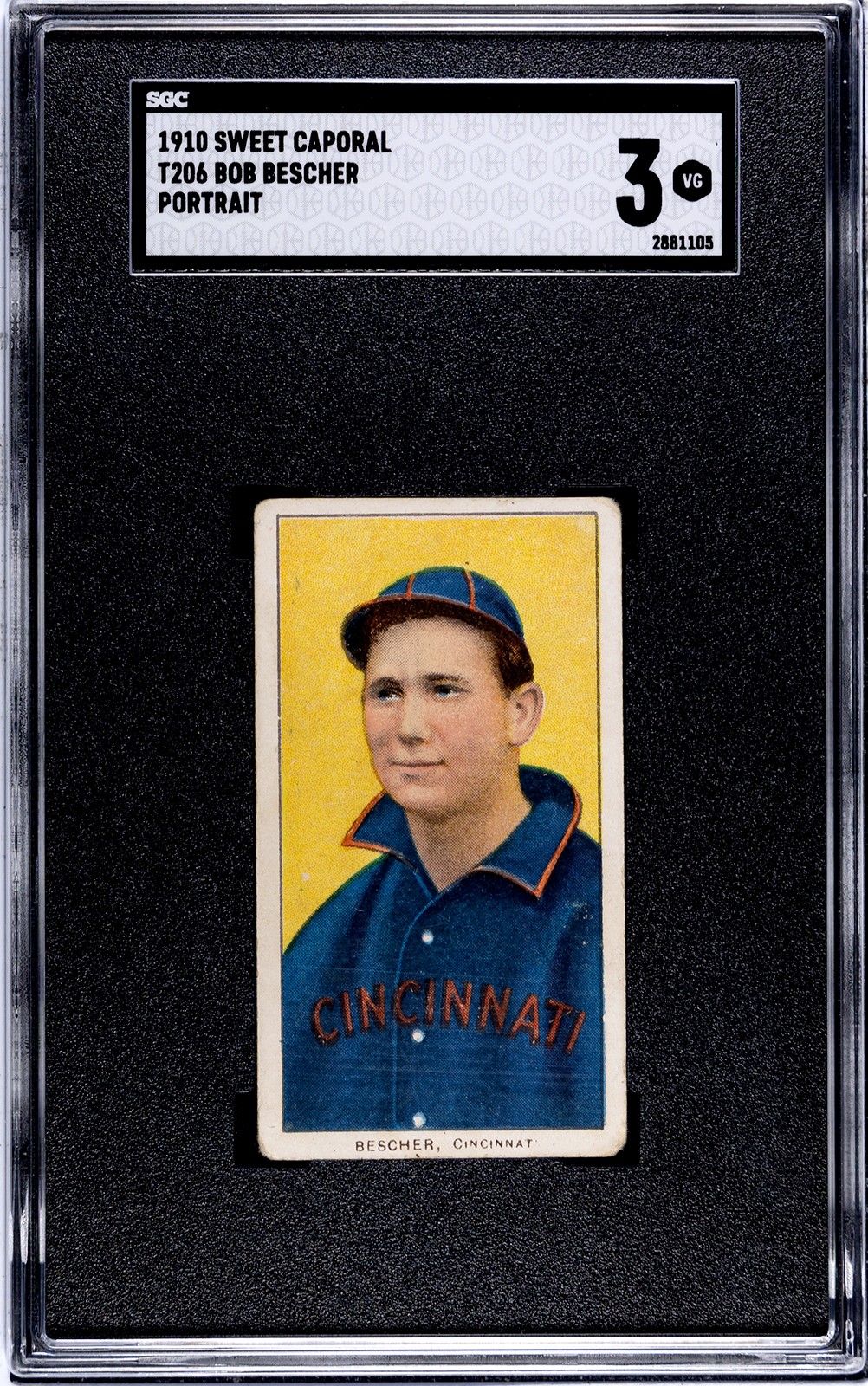 Bescher was an excellent outfielder who had speed to burn. He led the NL in stolen bases four consecutive years, which included seasons of 70 and 81 swipes. He also led the league in walks in 1913 and in runs scored in 1912. This is his Portrait version, with a Sweet Caporal 350 back.