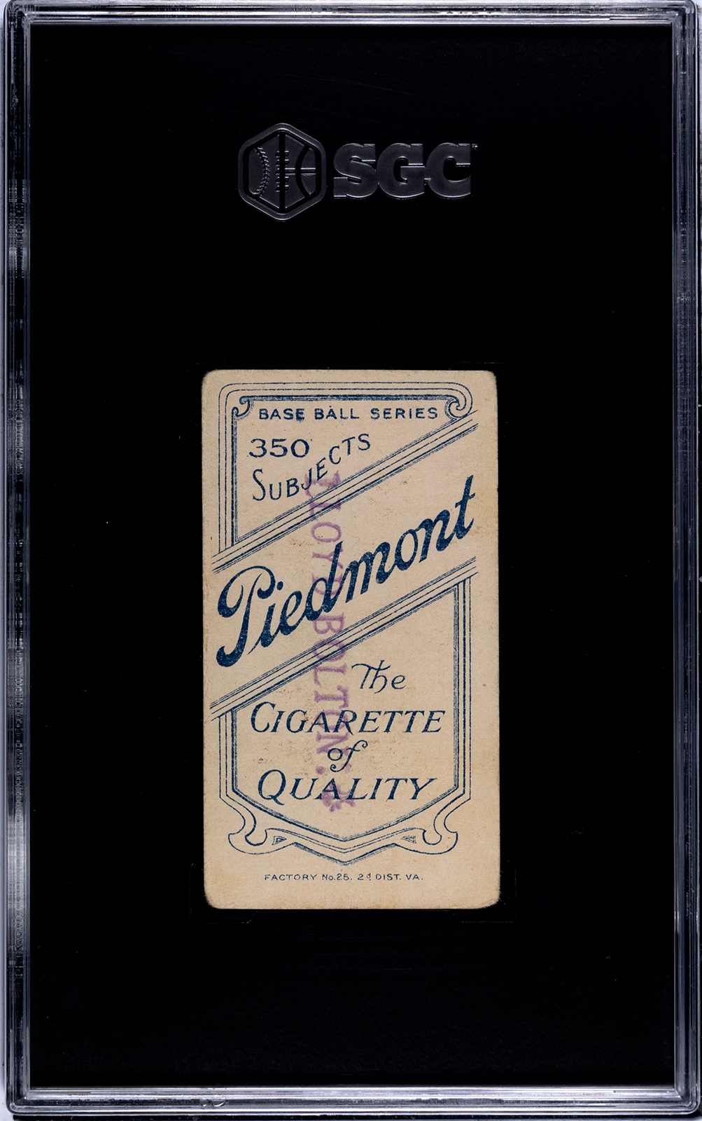Snodgrass was a solid outfielder with John McGraw’s strong New York Giants squad. He could hit, run and field and was a favorite of the HOF Manager. Unfortunately, he would be remembered for dropping a fly ball in the 1912 World Series. In the final game the Giants headed into the bottom of the tenth with a 2-1 lead, on the verge of winning their first World Series since 1905. Pinch hitter Clyde Engle led off the bottom of the tenth with a fly ball toward left center. The ball was hit more toward left field, but Snodgrass, coming from center field, called for it. He then dropped it for a two-base error. He proceeded to make a spectacular game-saving catch on the next play, a deep fly ball to center by Harry Hooper, but Tris Speaker then followed with a single to tie the game. A Larry Gardner sacrifice fly drove in the World Series winning run for the Red Sox. McGraw was not among those who blamed Snodgrass for the loss. In his book My Thirty Years in Baseball, McGraw remarked, “Often I have been asked what I did to Fred Snodgrass after he dropped that fly ball in the World Series of 1912…I will tell you exactly what I did: I raised his salary $1,000.” A stamp “Lloyd Bolton”, presumably a one-time owner of the card, adorns the Piedmont 350/25 back, and is graded accordingly.