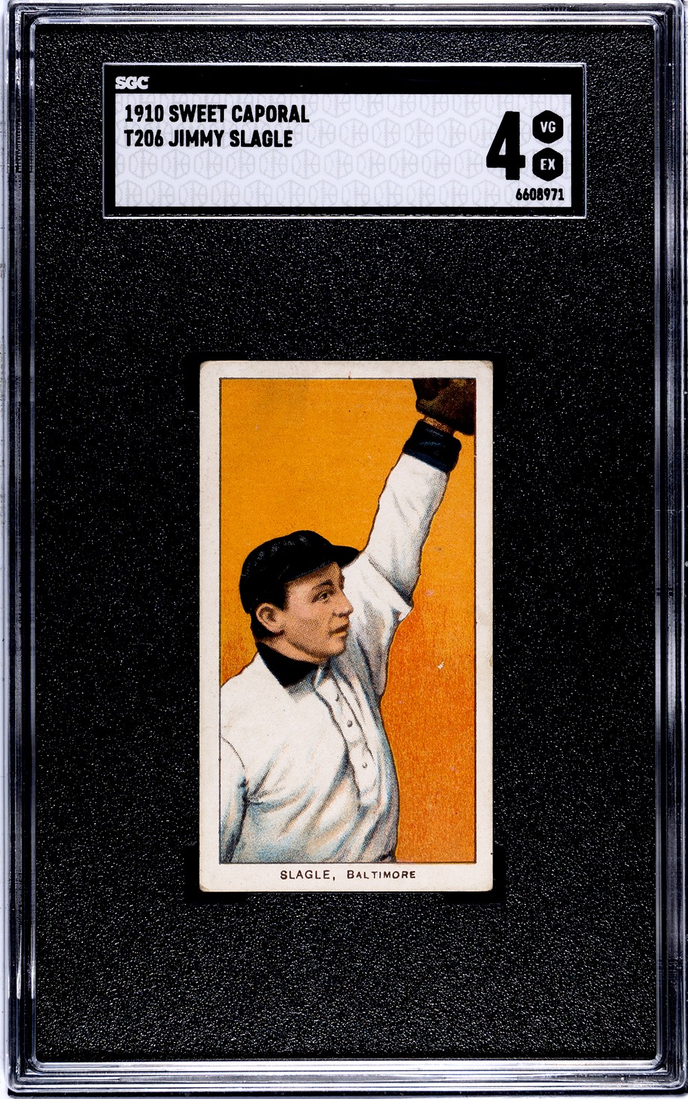 Slagle was a diminutive outfielder who lasted 10 seasons in the big leagues, and 16 pro seasons overall. His best season was 1902 when he hit .315 and stole 41 bases for the Cubs, with whom he’d win a World Series in 1907. This card features him with the Baltimore Orioles of the Eastern League and comes with a Sweet Caporal 350 back (1910).