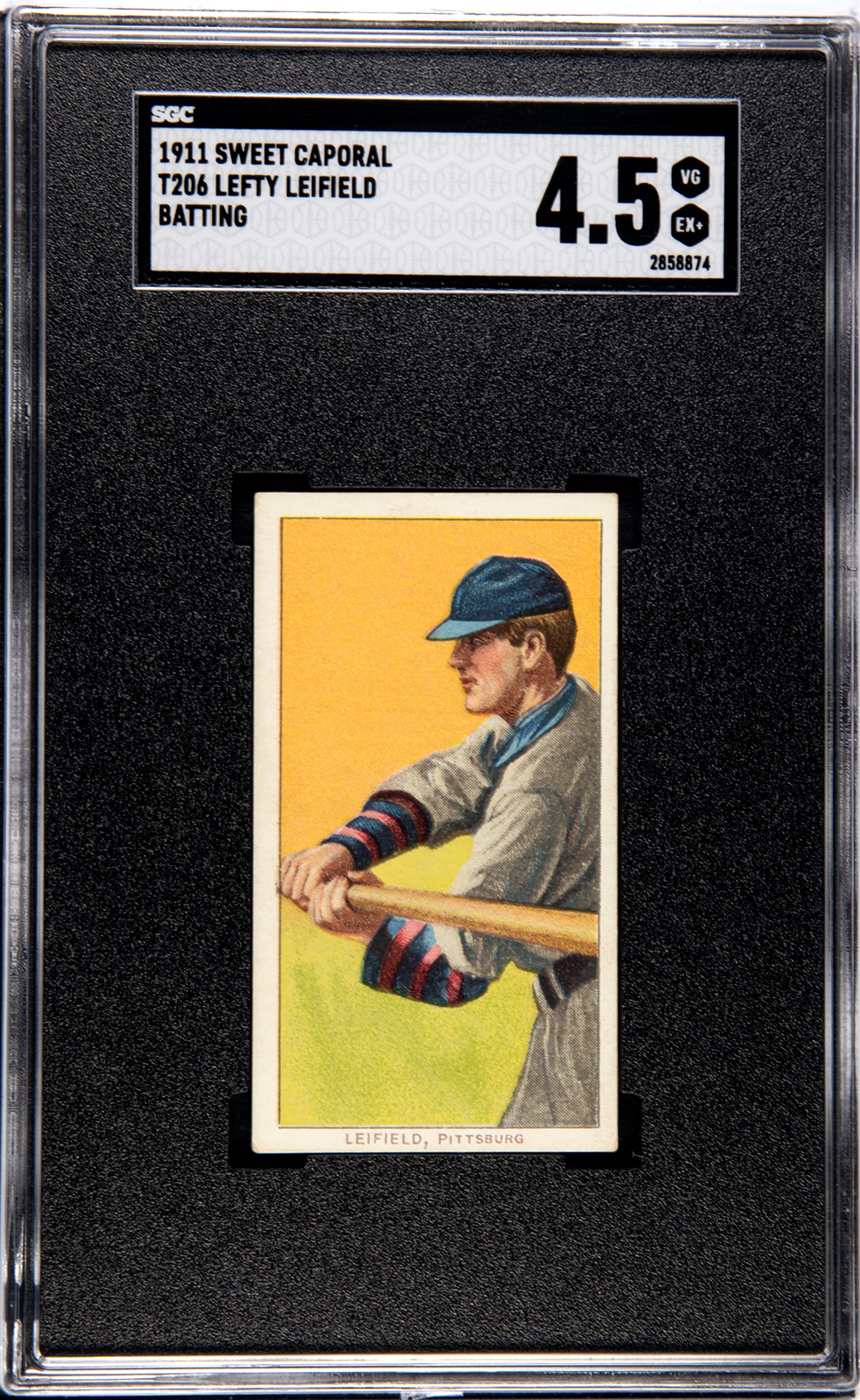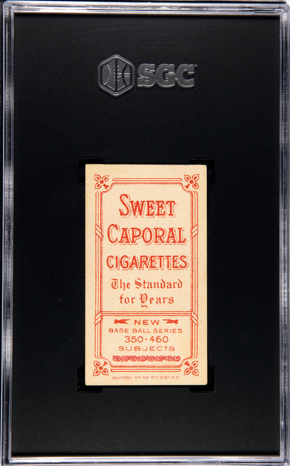Lefty was a solid pitcher who won a World Series in 1909 with Honus Wagner and the Pittsburgh Pirates. He would 124 big league games which included 19- and 20-win seasons. This one comes with the uncommon Sweet Caporal 35-460 “overprint” factory 42 back (1911). This is 1 of 2, with only 1 graded higher, among the 16 graded by SGC. There are only 35 examples of this card/back combo between SGC and PSA.