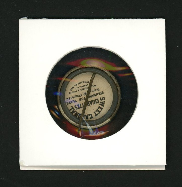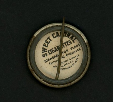 This tiny pre-war pin was issued by Sweet Caporal cigarettes between 1910 and 1912.  The set features more than 200 pins, thanks to several variations.  Many of the photos used are the same as those in the popular T-205 tobacco card set.