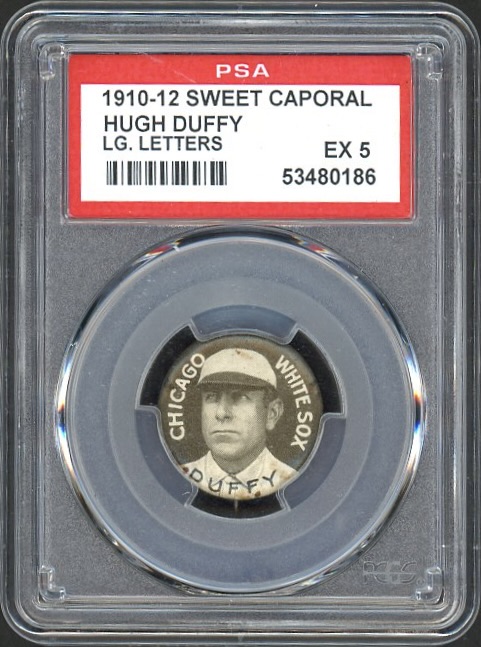 From the ultimate pre-war pin set, HOFer Duffy was one the early game’s best hitters. Over the course of his 17-year career he was a consistent run producer with high batting averages. His peak seasons were 1888 to 1899. During this run he would win a pair of batting titles, including racking up a .440 average in 1894. He would also drive in 100+ runs 8 times in 9 seasons. BY the time this pin was issued he was a full-time manager. This one is the tougher “large letter” version and represents an affordable pre-war HOFer from a classic set!
