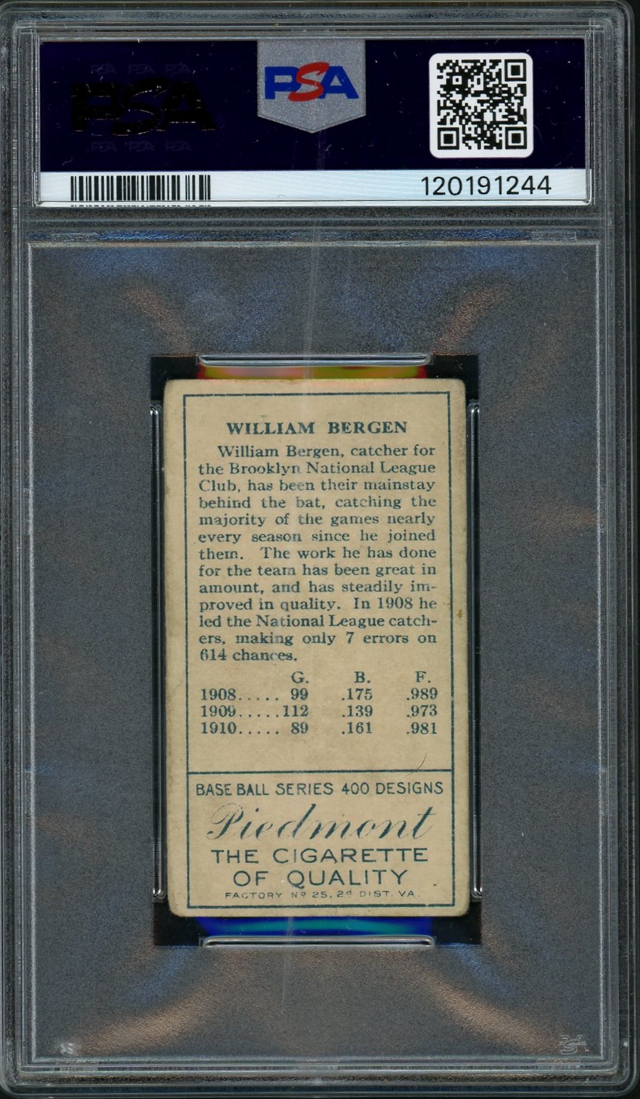 Bergen was the epitome of a Deadball Era catcher. He hit better than .200 only once in his 11 Big League seasons, but his strength was in his defensive contributions. He led the NL in assists three times, in double plays once and fielding percentage twice. With a Piedmont back.