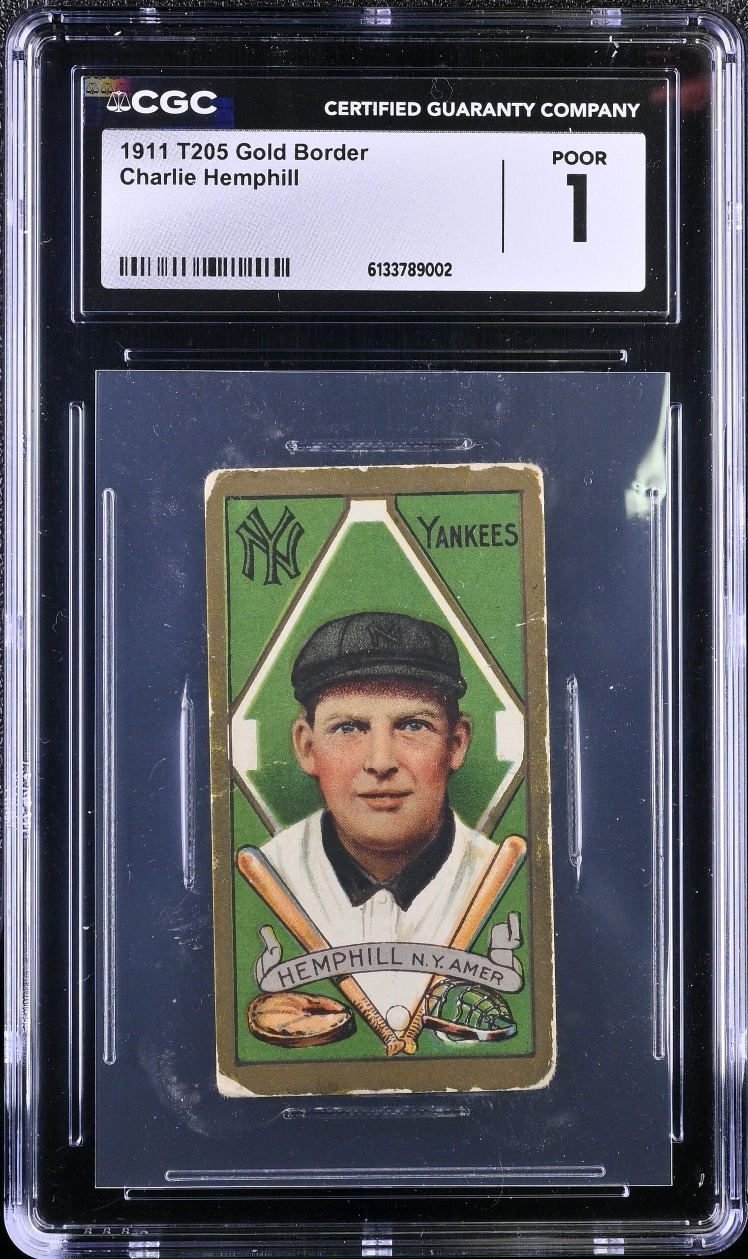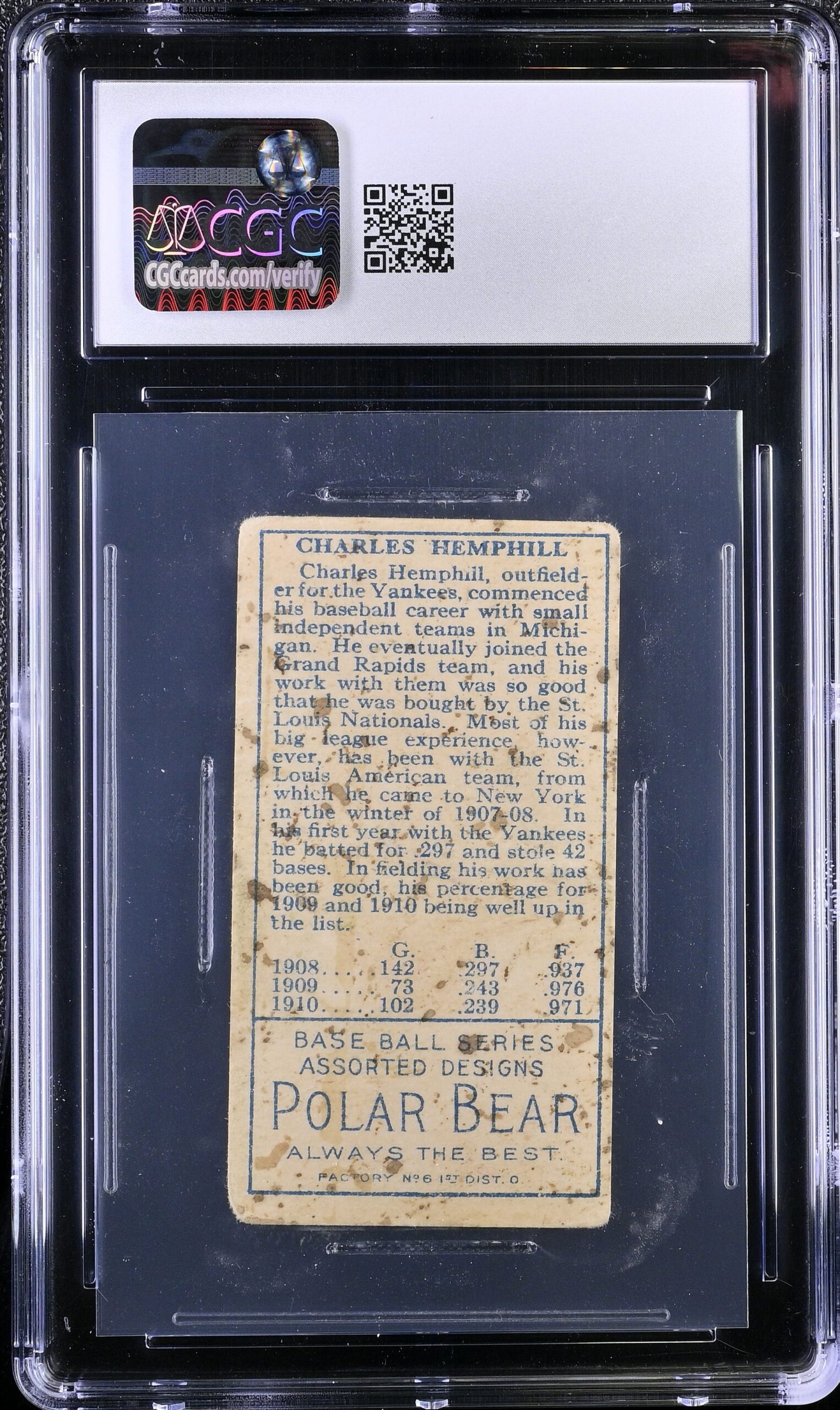 Charlie Hemphill was a solid big-league outfielder, playing from 1899 through 1911. He stole a few bases, smacked out some hits, and did enough to earn a major league salary more than most. As with many of the Polar Bear backs, this one has some tobacco stains on the back (Polar Bear was sold as unrolled, scrap tobacco in pouches and many cards with this brand show staining).