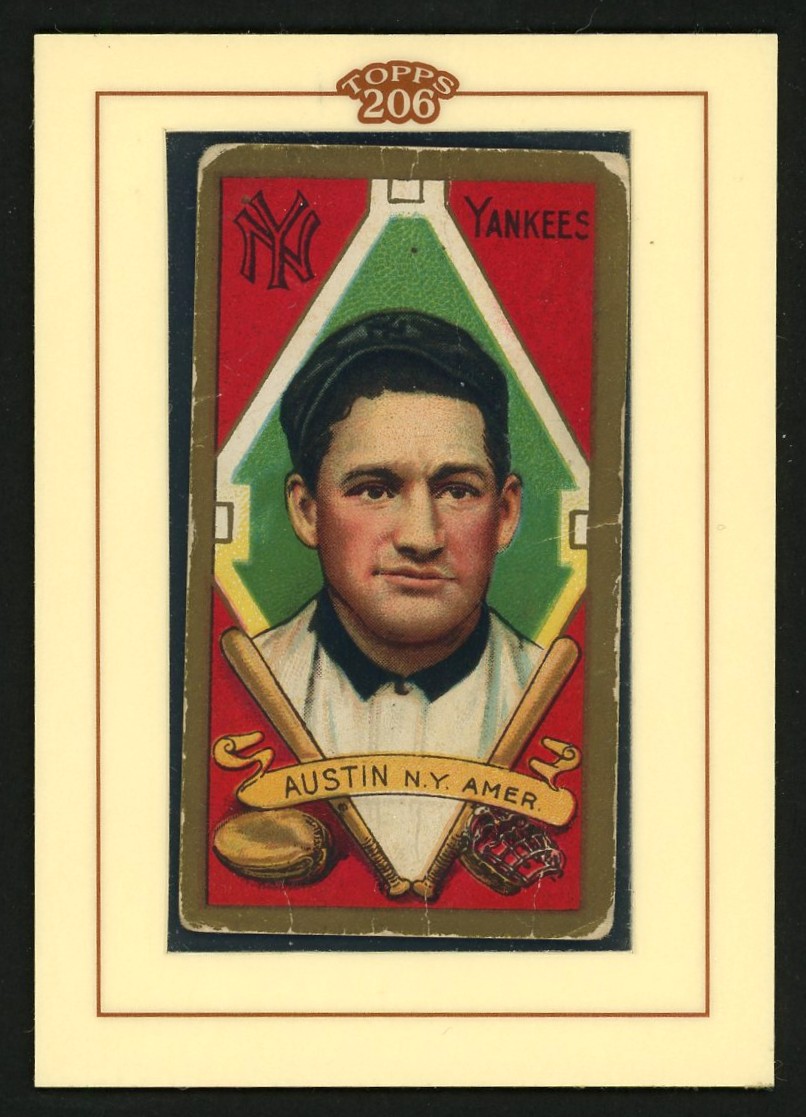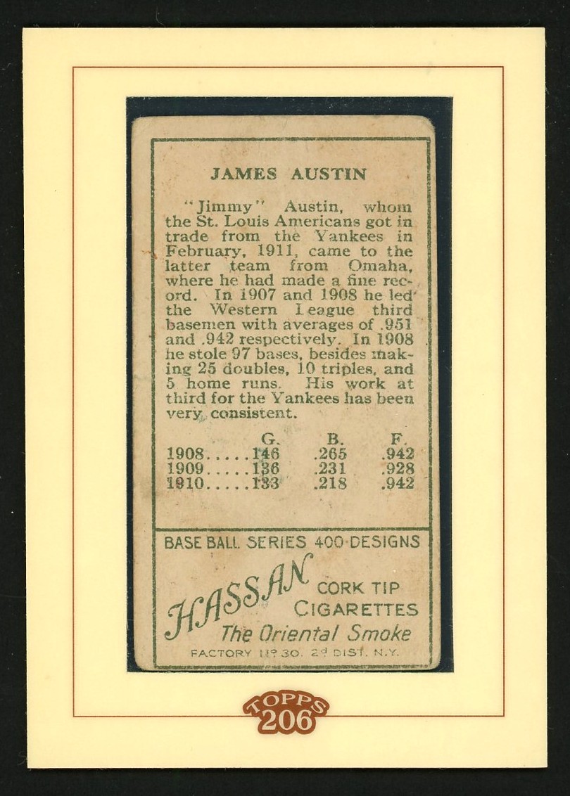 Jimmy Austin, a solid player who lasted 18 seasons (more or less) in the big leagues, is pictured here as a member of the New York Highlanders who at the time were also informally referred to as the “Yankees”. It would be two more years before the team would officially change its name, and this set appears to the first to use the Yankees name.