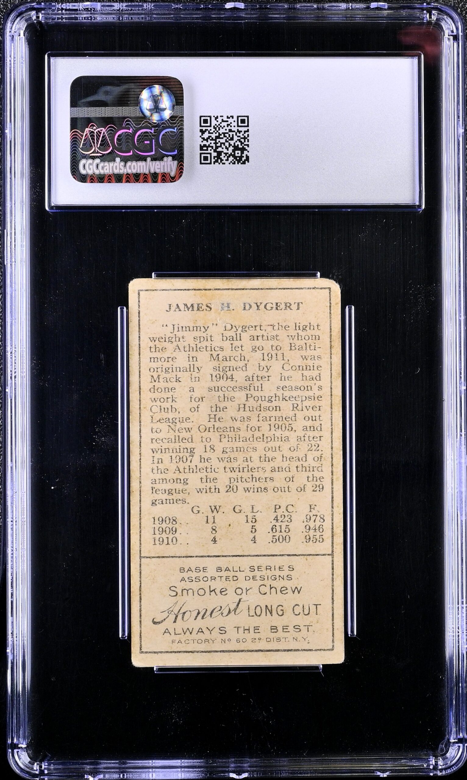 Dygert was a spitball specialist when the pitch was still legal. In 1906 he pitched a combined no-hitter with Rube Waddell despite being one of the lightest players in the game, weighing around 120 pounds. In 1907 on a pitching staff with three Hall of Famers – Chief Bender, Eddie Plank, and Waddell – Dygert was the number three starter and completed the season with a 21–8 record, 151 strikeouts, and a 2.34 earned run average. In the pennant stretch of October, he pitched three shutouts in four days. He would be out of baseball within a couple of years. This one comes with the somewhat scarcer Honest Long Cut back, and excellent eye appeal for the grade.