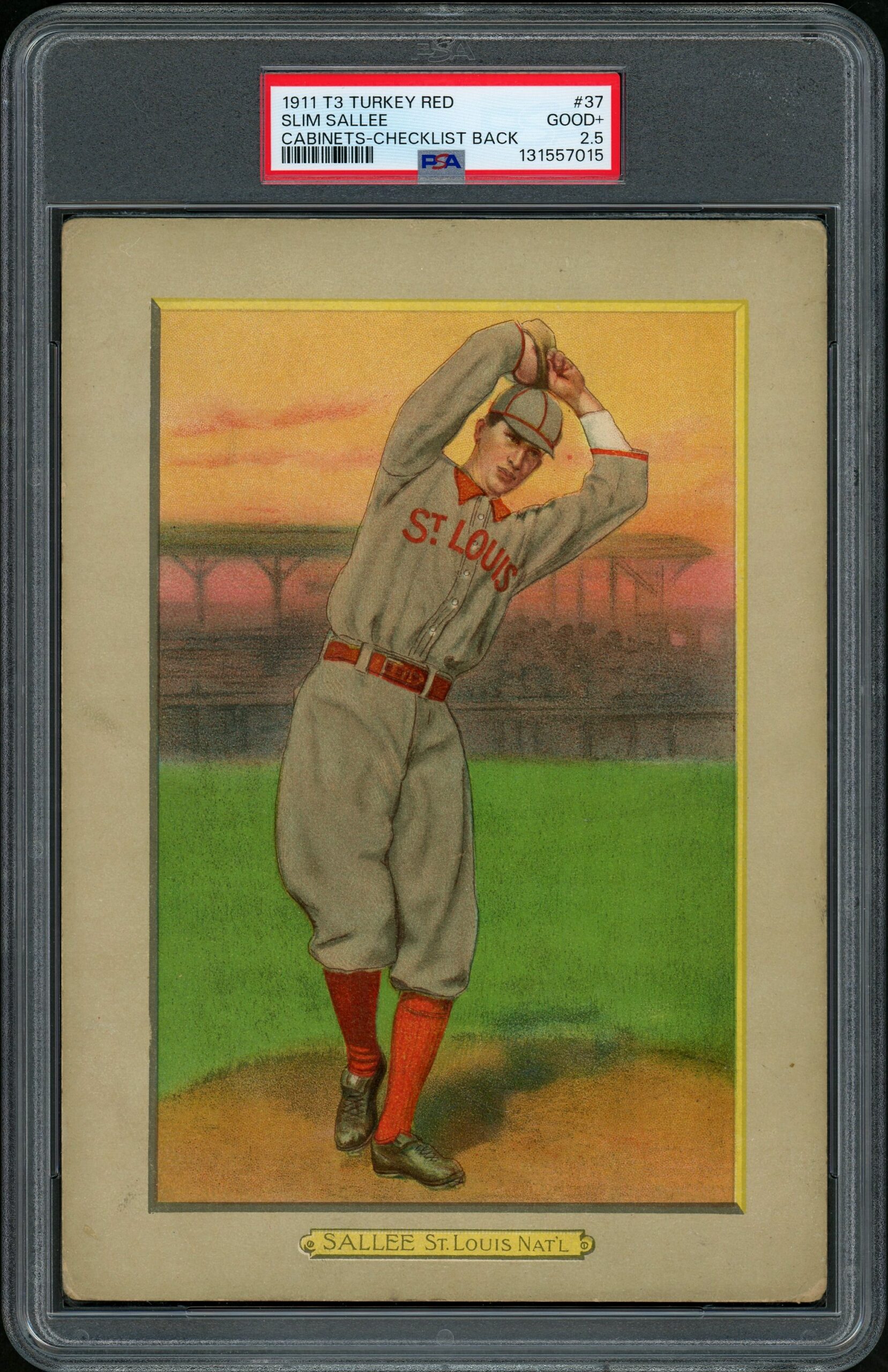 From the spectacular T3 Turkey Red set, these gorgeous cabinet cards are among the most popular and iconic pre-war issues. Sallee was a successful pitcher who lasted 14 big league seasons. He won 10+ games nine times, including seasons of 18 (2x), 19 and 21 wins. He was a World Series winner in 1919, led the league in saves three times, posted ERA’s under 3.00 11 times, and finished with a career record of 174-143. Due to their size the T3’s are very tough to find in higher grades. This one as the checklist back (Turkey Red advertising backs are also available) and is graded 2.5 GD+ by PSA.