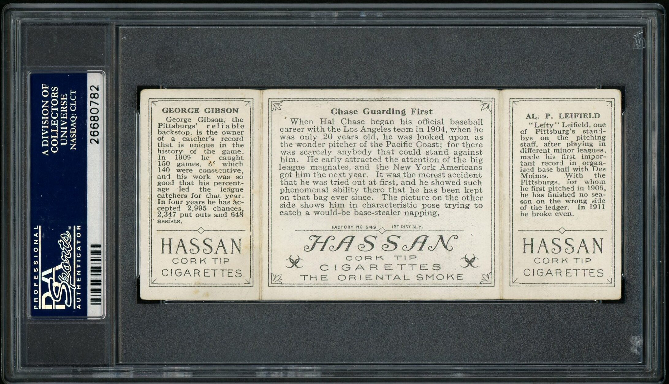 From the classic Hassan Triple Folder issue of 1912, this uniquely designed card features two single player end panels and an action photo in the center panel. This card has Canadian catcher Goerge Gibson, one of the best of the Deadball Era, and pitcher Lefty Leifield on the ends, while Hal Chase occupies the center panel. Chase was a big star at the time, the best first baseman in the game. He would eventually be pushed out of organized ball after the Black Sox scandal when allegations of gambling and throwing games came to light. His unceremonious exit from the big leagues most certainly cost him a place in the Hall of Fame.