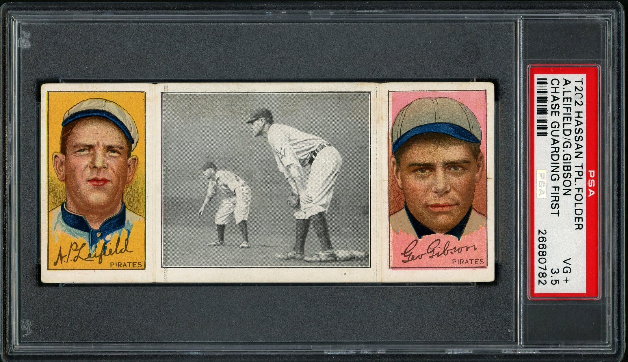 From the classic Hassan Triple Folder issue of 1912, this uniquely designed card features two single player end panels and an action photo in the center panel. This card has Canadian catcher Goerge Gibson, one of the best of the Deadball Era, and pitcher Lefty Leifield on the ends, while Hal Chase occupies the center panel. Chase was a big star at the time, the best first baseman in the game. He would eventually be pushed out of organized ball after the Black Sox scandal when allegations of gambling and throwing games came to light. His unceremonious exit from the big leagues most certainly cost him a place in the Hall of Fame.