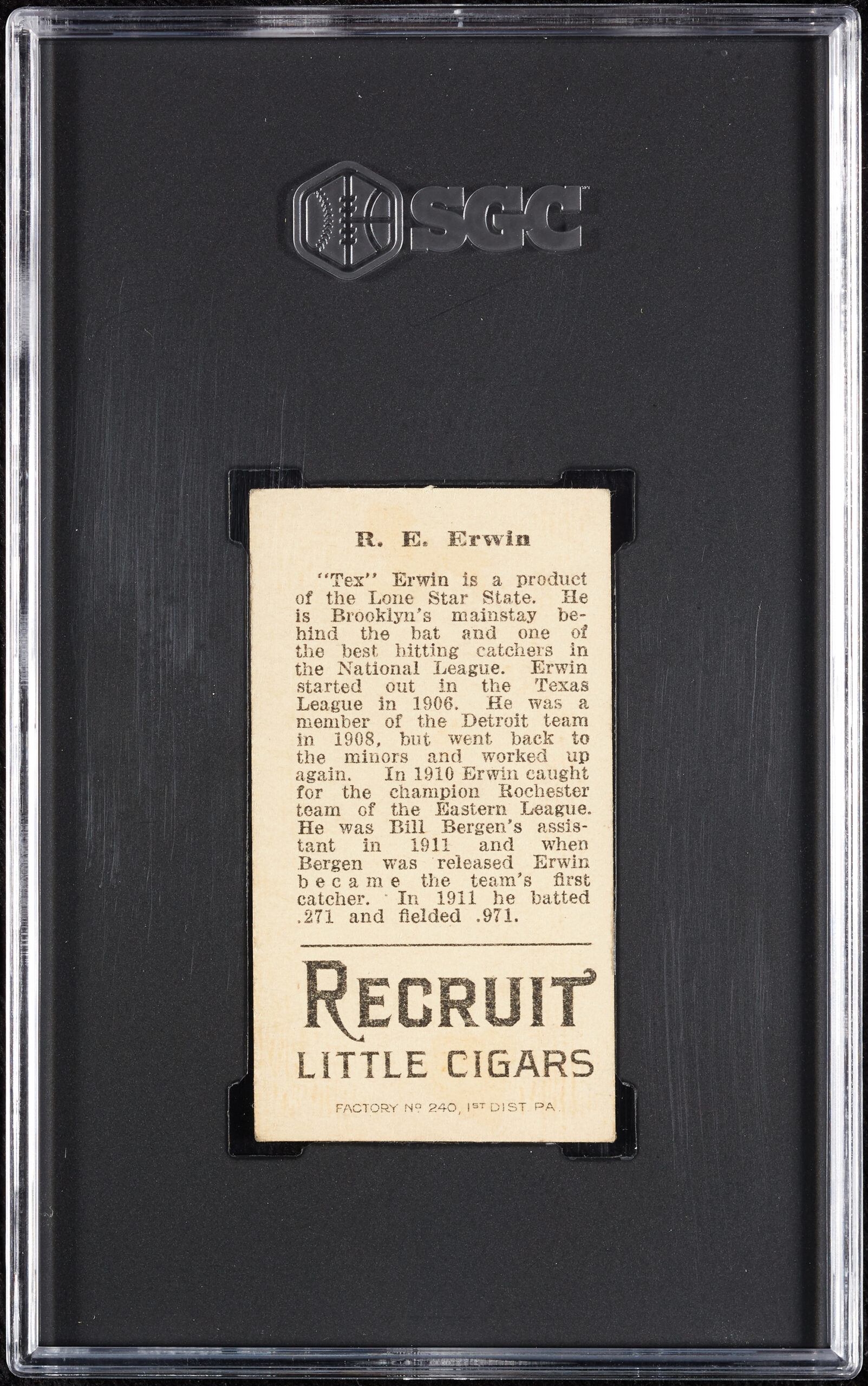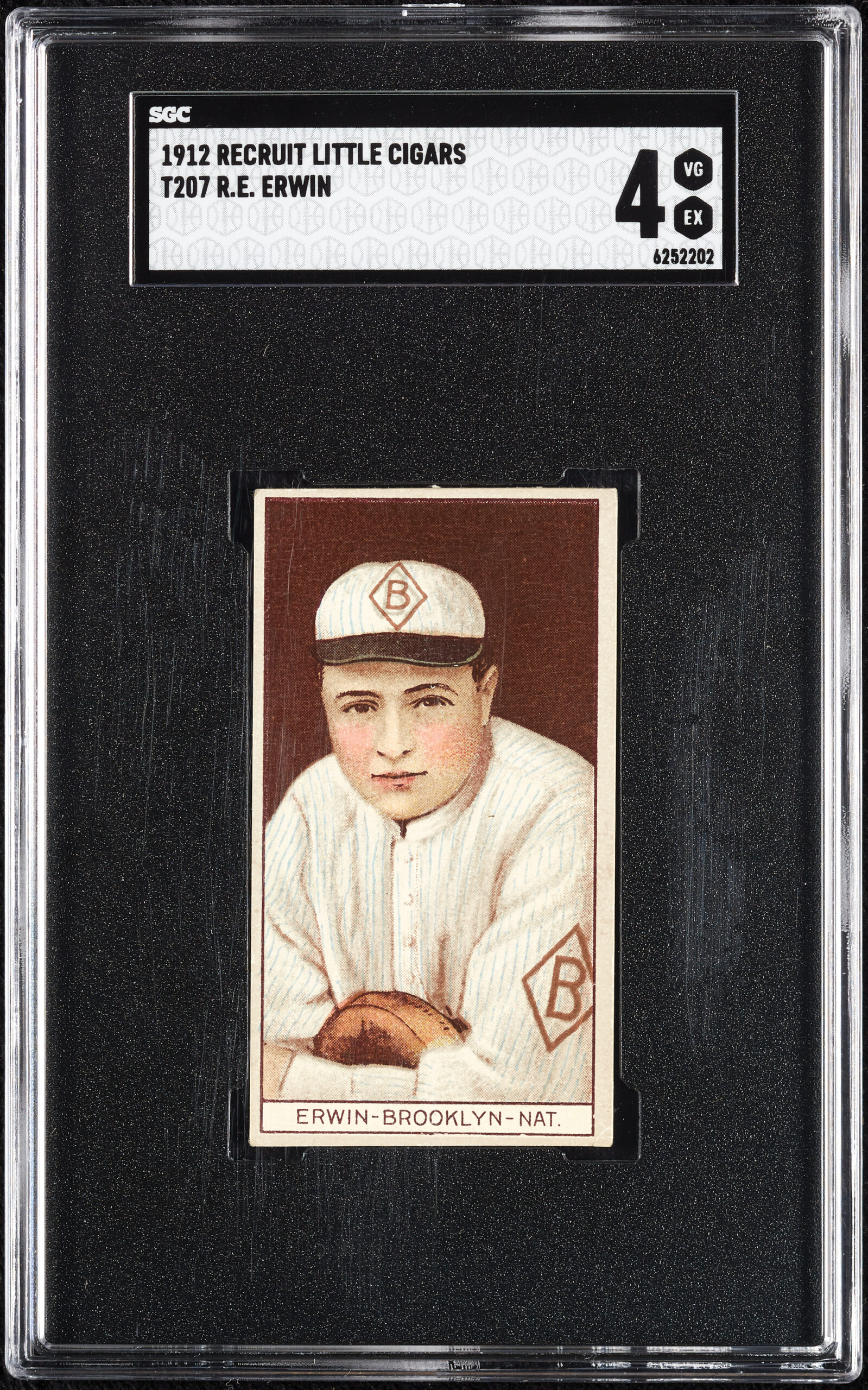 From the classic T207 Recruit Little Cigars “Brown Background” set, featuring R.E. “Tex” Erwin, a catcher and first baseman who played six seasons in the big leagues and 10 more in the minors.