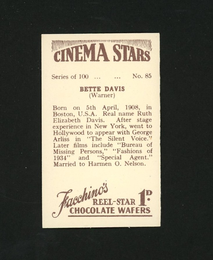 From the 1936 Facchino’s Cinema Stars set, featuring mega-star Bette Davis, winner of two Academy Awards (and nominated eight other times).