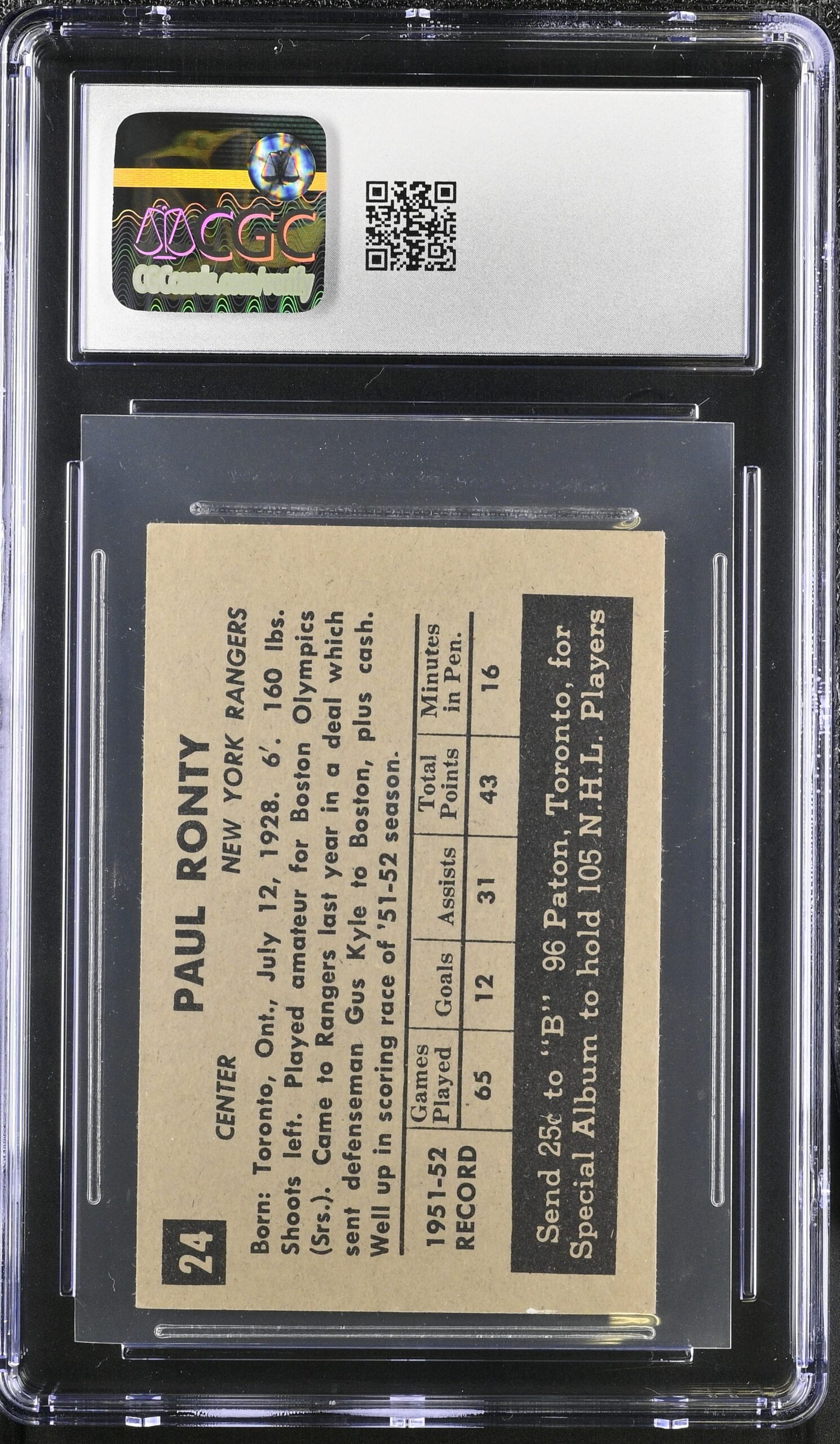 Sharp high-grade card of the Rangers’ Paul Ronty who had a brief but productive 8-year NHL career.