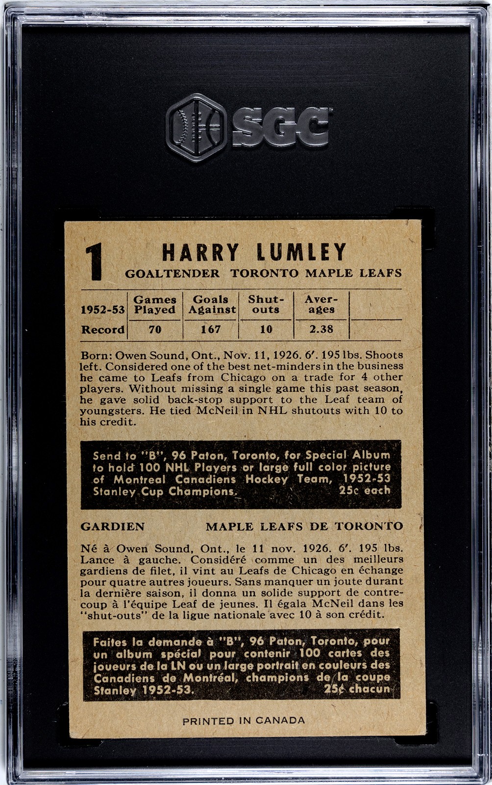 Excellent mid-grade example of this popular goalie card featuring HOFer, Harry Lumley. Long known as a very condition sensitive card, the combination of the horizontal action pose, a Hall of Fame goaltender, and the #1 card in the set which always bore the brunt of primitive storage methods, this card has plenty of cache. Well centered and very presentable for the grade.