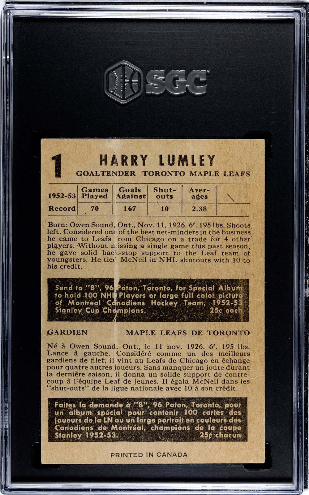 Great eye appeal on this low-grade #1 Lumley, HOF goaltender of the Toronto Maple Leafs. This card presents very well on the front. On the back, there is a strip of paper loss and some light creasing is visible.