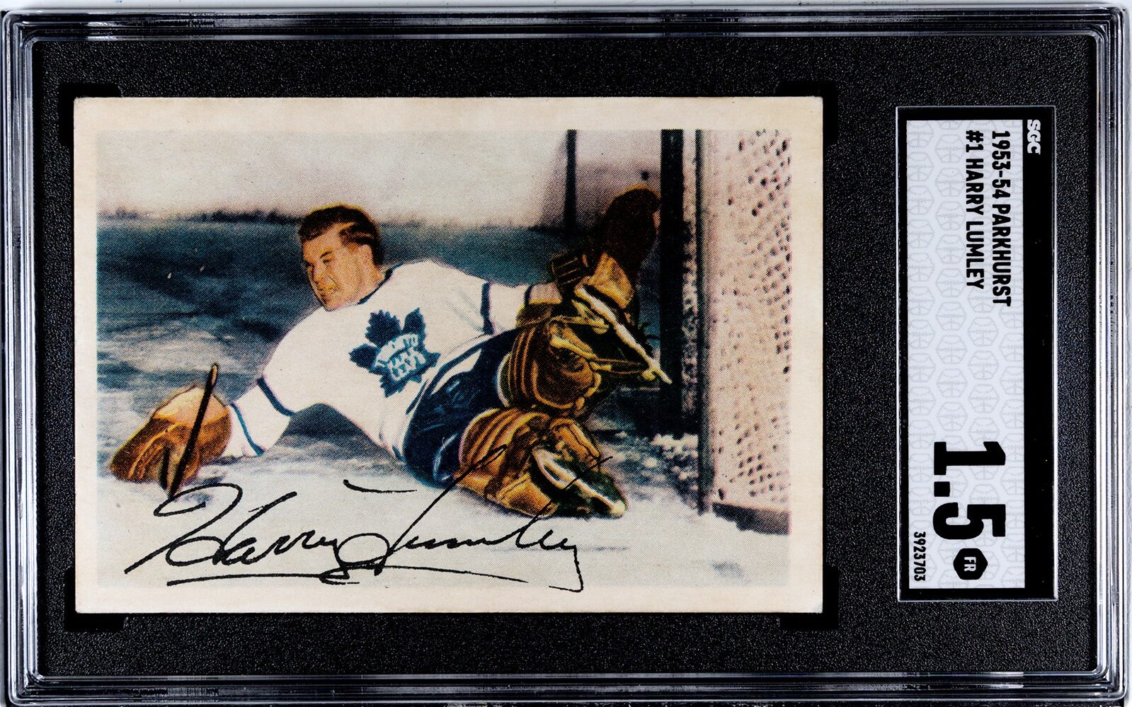 Great eye appeal on this low-grade #1 Lumley, HOF goaltender of the Toronto Maple Leafs. This card presents very well on the front. On the back, there is a strip of paper loss and some light creasing is visible.