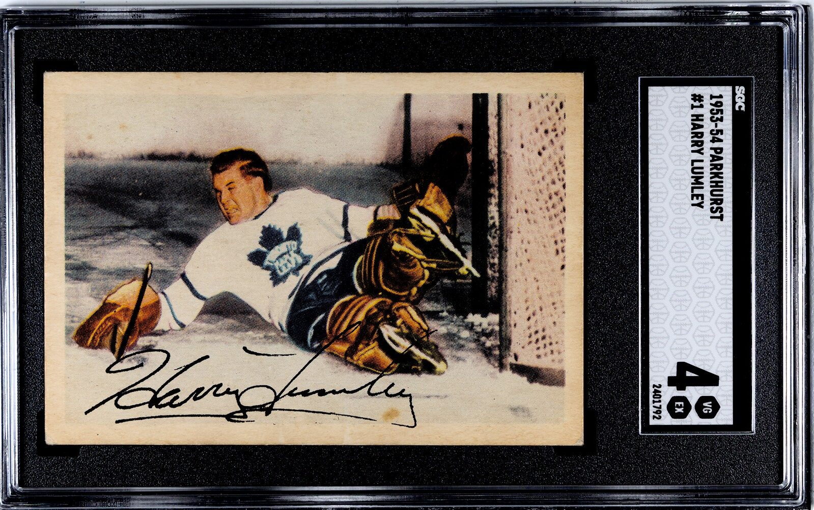 Excellent mid-grade example of this popular goalie card featuring HOFer, Harry Lumley. Long known as a very condition sensitive card, the combination of the horizontal action pose, a Hall of Fame goaltender, and the #1 card in the set which always bore the brunt of primitive storage methods, this card has plenty of cache. Well centered and very presentable for the grade.