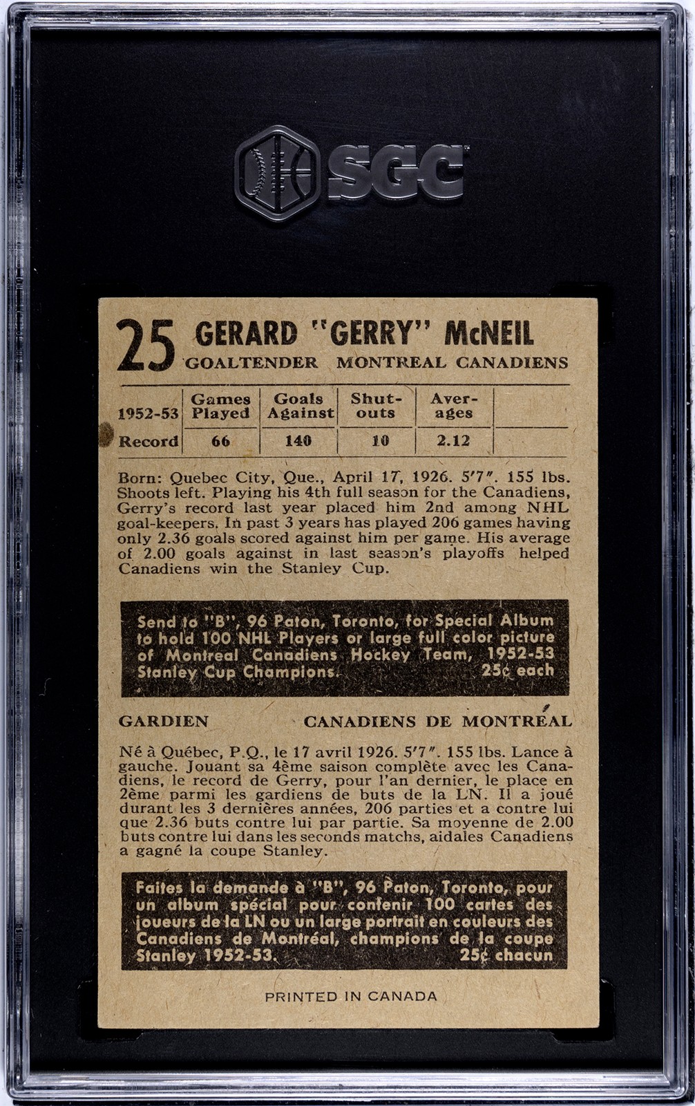 Gerry McNeil had a brief career as the Canadiens number one goaltender. He led Montreal to the Stanley Cup Finals all four seasons from 1950 to 1954. He retired after the 1953-54 seasons but came back a year later and served in a backup and replacement role for a few years, playing mostly in the minors. He finished his NHL career with a 2.32 GAA for the regular season and a 1.89 in the playoffs. Classic 1950s goalie card, presents very well for the grade!