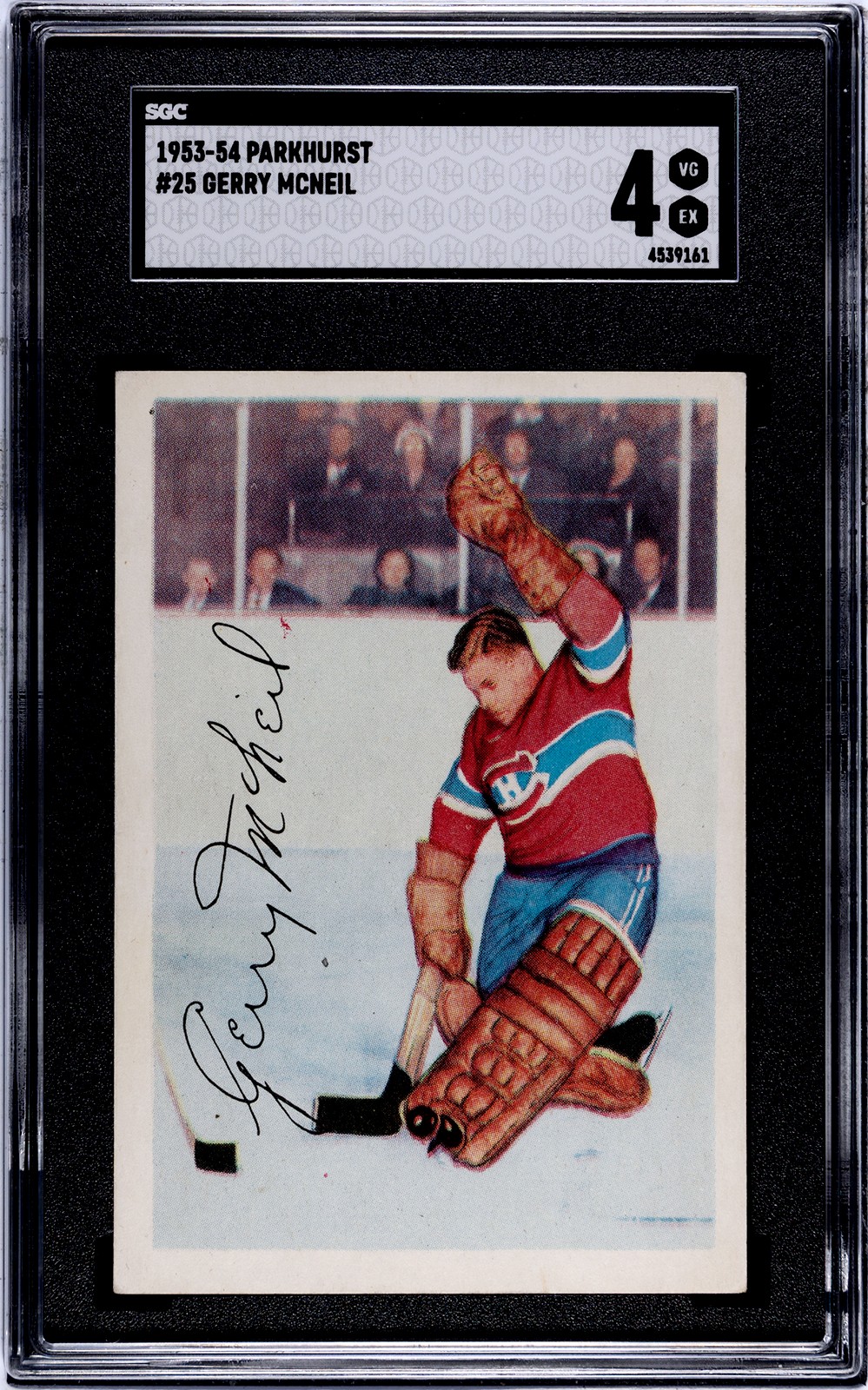 Gerry McNeil had a brief career as the Canadiens number one goaltender. He led Montreal to the Stanley Cup Finals all four seasons from 1950 to 1954. He retired after the 1953-54 seasons but came back a year later and served in a backup and replacement role for a few years, playing mostly in the minors. He finished his NHL career with a 2.32 GAA for the regular season and a 1.89 in the playoffs. Classic 1950s goalie card, presents very well for the grade!
