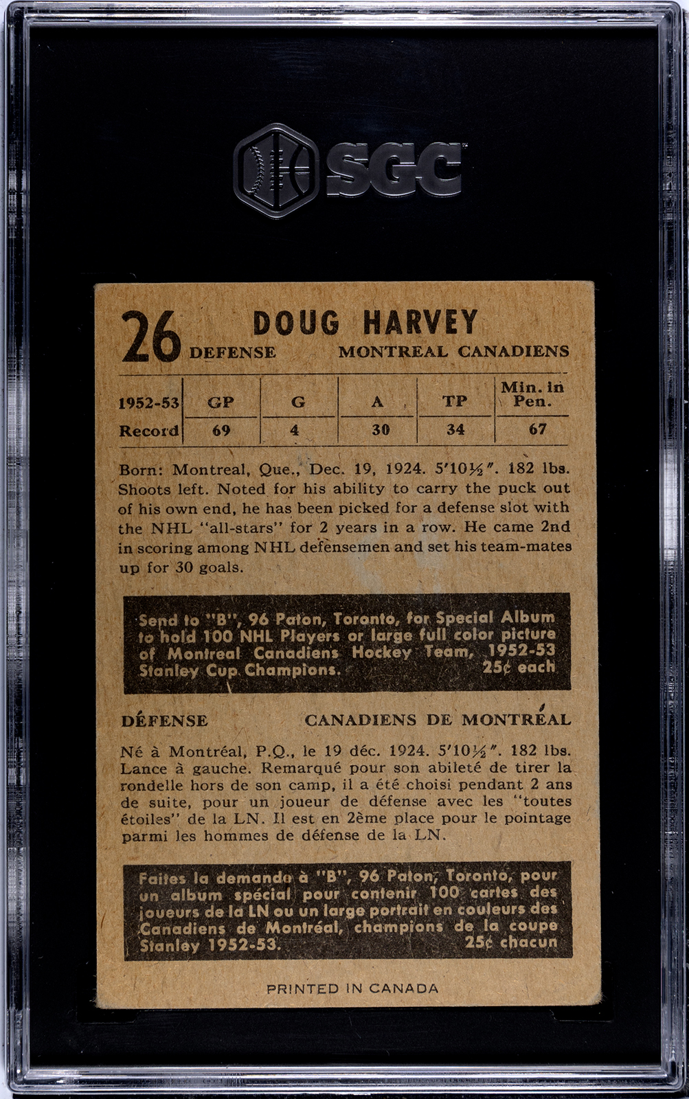 Clean and presentable lower-grade card of this all-time great HOFer. Harvey was a game changer. In his prime he was the best in the game and today ranks among the best ever. He won 7 of the first 9 Norris Trophies and was named first team all-star 1o times in 11 seasons. He won six Stanley Cups with Montreal and was the quarterback of their five Cup dynasty team of the late 1950s.