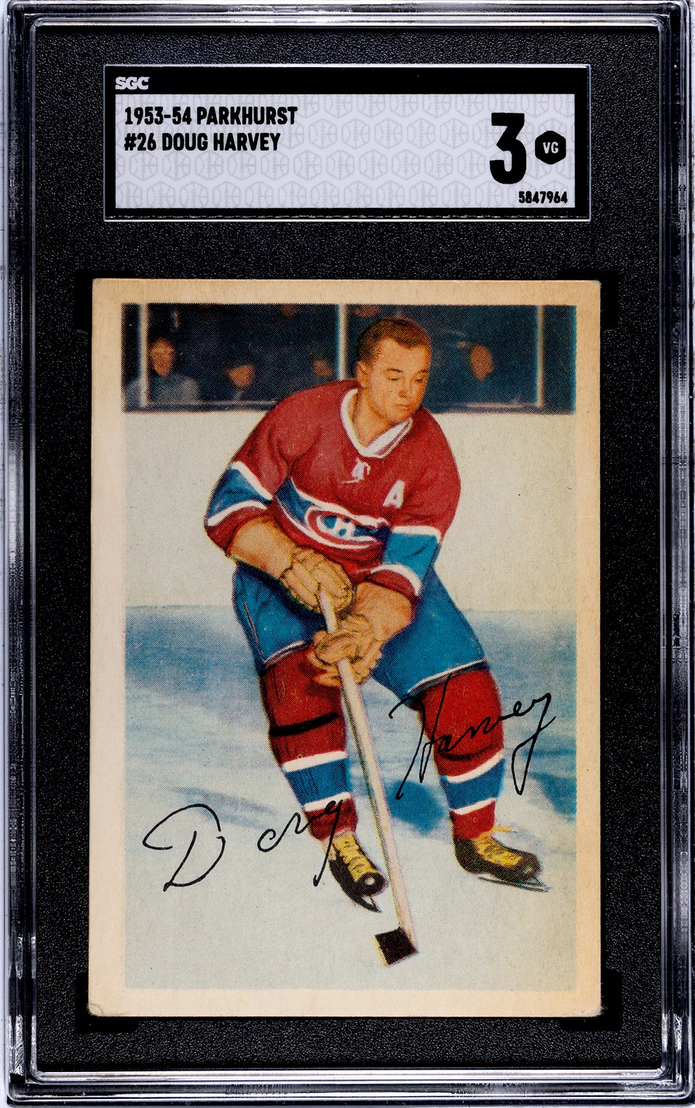 Clean and presentable lower-grade card of this all-time great HOFer. Harvey was a game changer. In his prime he was the best in the game and today ranks among the best ever. He won 7 of the first 9 Norris Trophies and was named first team all-star 1o times in 11 seasons. He won six Stanley Cups with Montreal and was the quarterback of their five Cup dynasty team of the late 1950s.