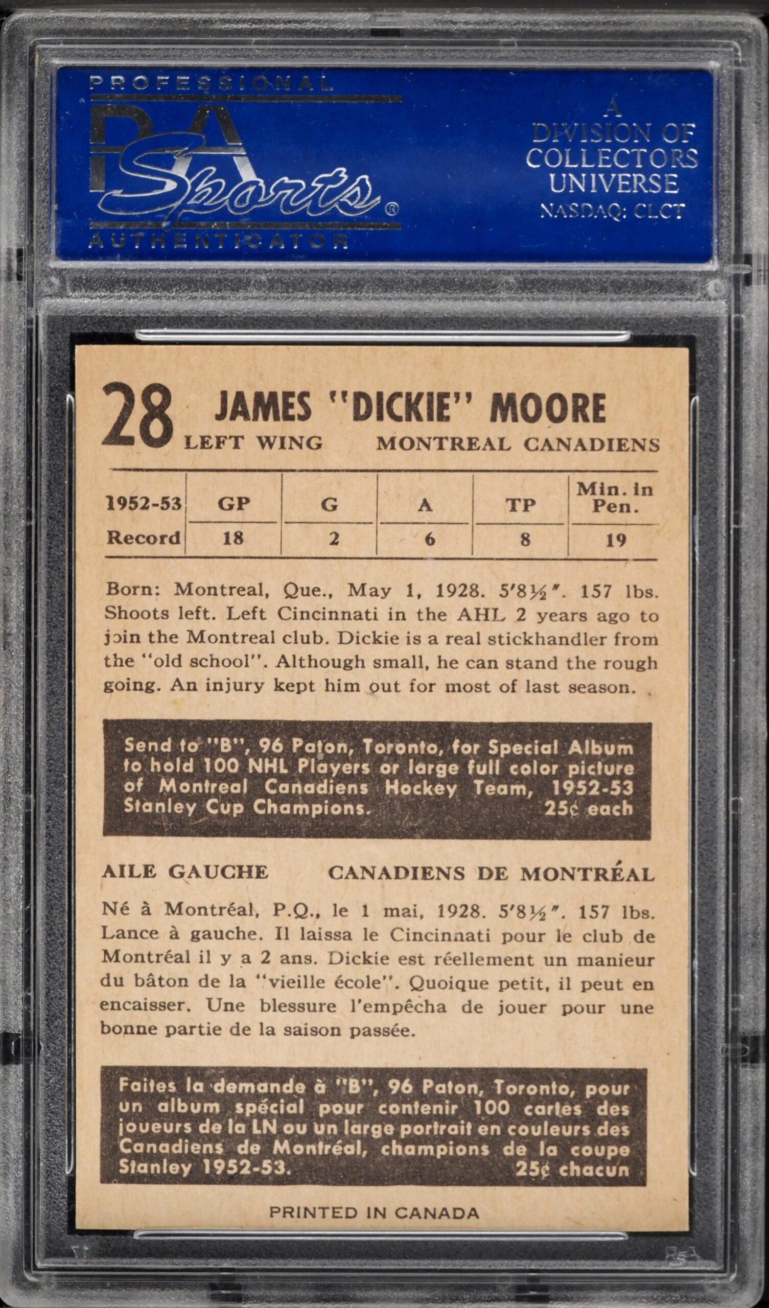 High-grade 2nd-year card of Canadiens HOFer, Dickie Moore. This card is well known for its uncorrected error, in that this card actually pictures Habs star rookie Jean Beliveau and not Moore. This is the set of Beliveau’s prized and very expensive rookie card, adding more collectability. Moore was an excellent player himself, winner of two scoring titles and six Stanley Cups with Montreal. Of the 187 examples graded by PSA, only 7 grade higher.