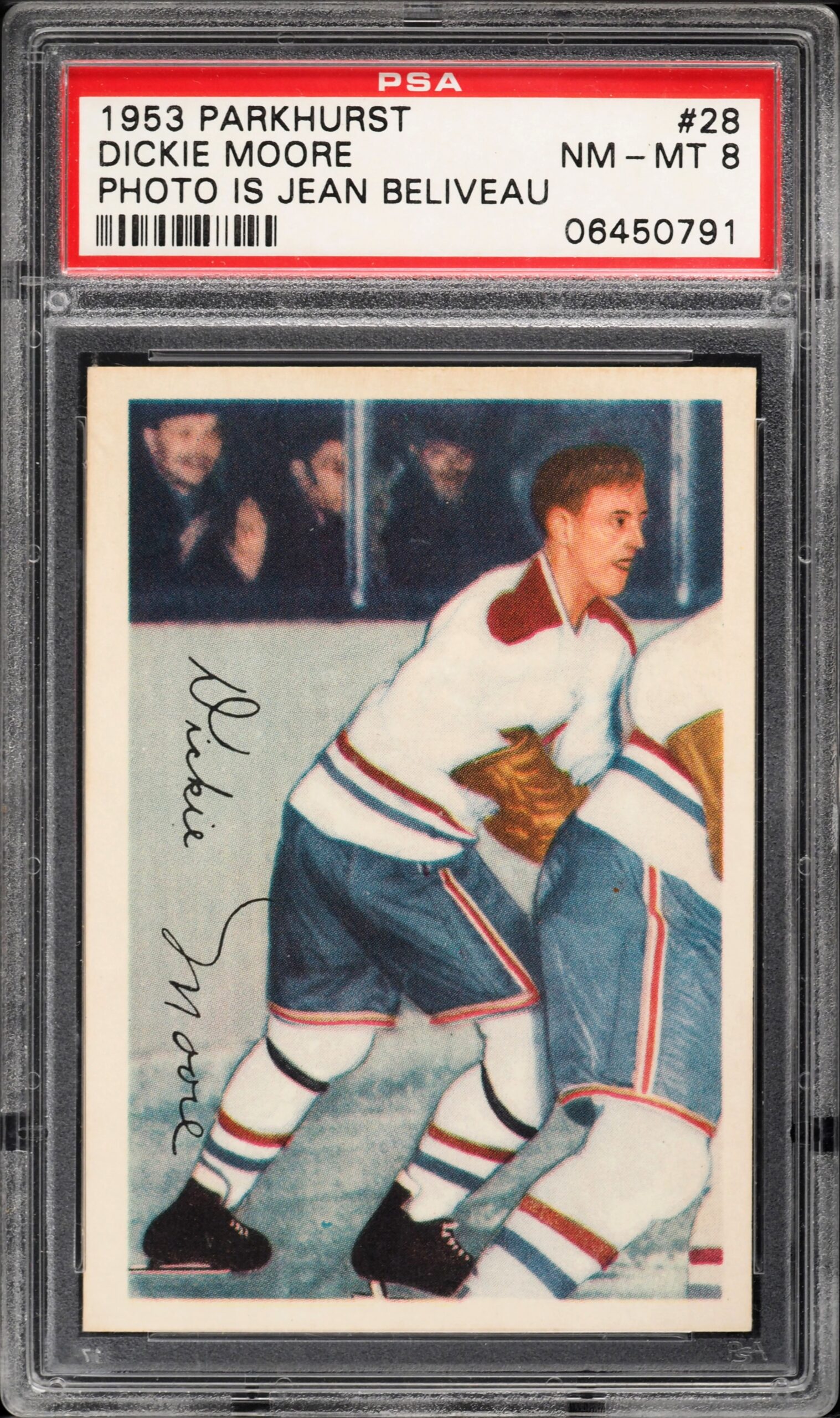High-grade 2nd-year card of Canadiens HOFer, Dickie Moore. This card is well known for its uncorrected error, in that this card actually pictures Habs star rookie Jean Beliveau and not Moore. This is the set of Beliveau’s prized and very expensive rookie card, adding more collectability. Moore was an excellent player himself, winner of two scoring titles and six Stanley Cups with Montreal. Of the 187 examples graded by PSA, only 7 grade higher.