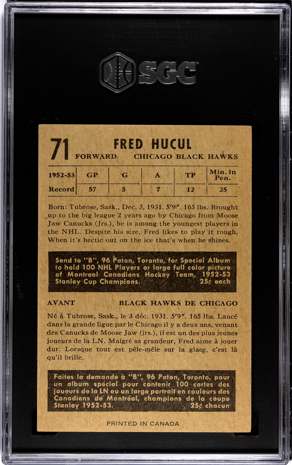 Hucul broke in with Chicago during 1950-51 season and split the next few years shuffling back and forth to the minors. During 1953-54 season he would embark on a long minor league career in which he won championships in the QHL (Quebec, 1954) and in the WHL (Victoria, 1966). When expansion came to the NHL, he would play 65 games for the St. Louis Blues in 1967-68.