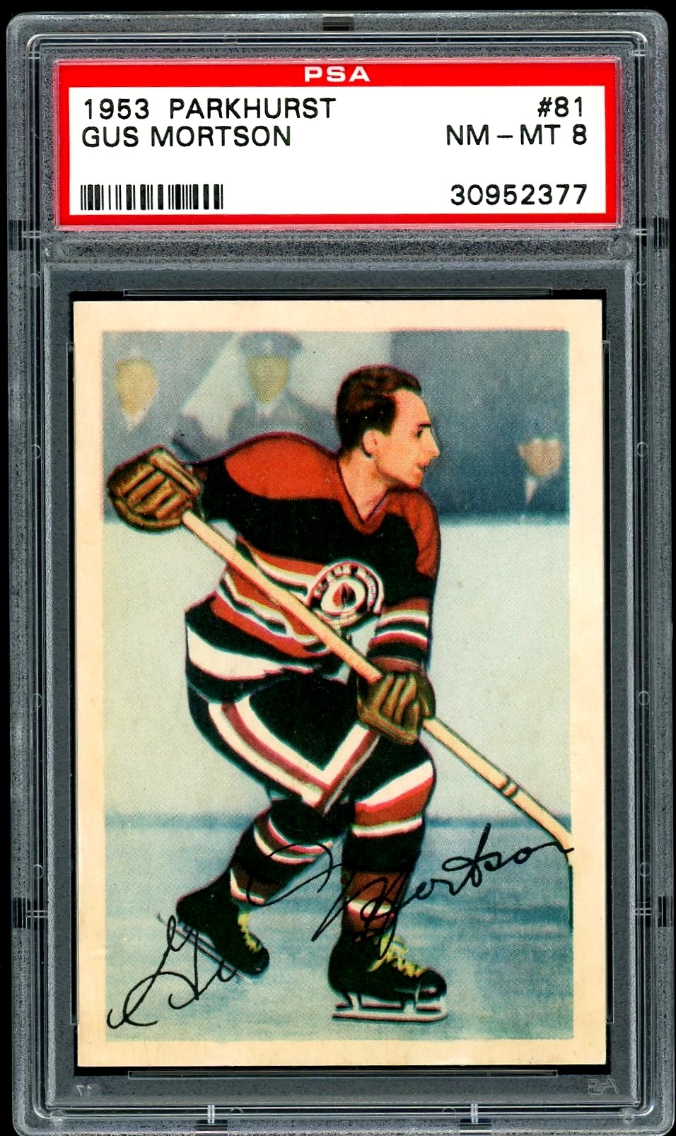 Stunning condition, right out of the pack! Tough guy Mortson led the NHL in PiM’s four times and even fought Gordie Howe in an all-star game. Of the 124 examples graded by PSA, only 7 grade higher.