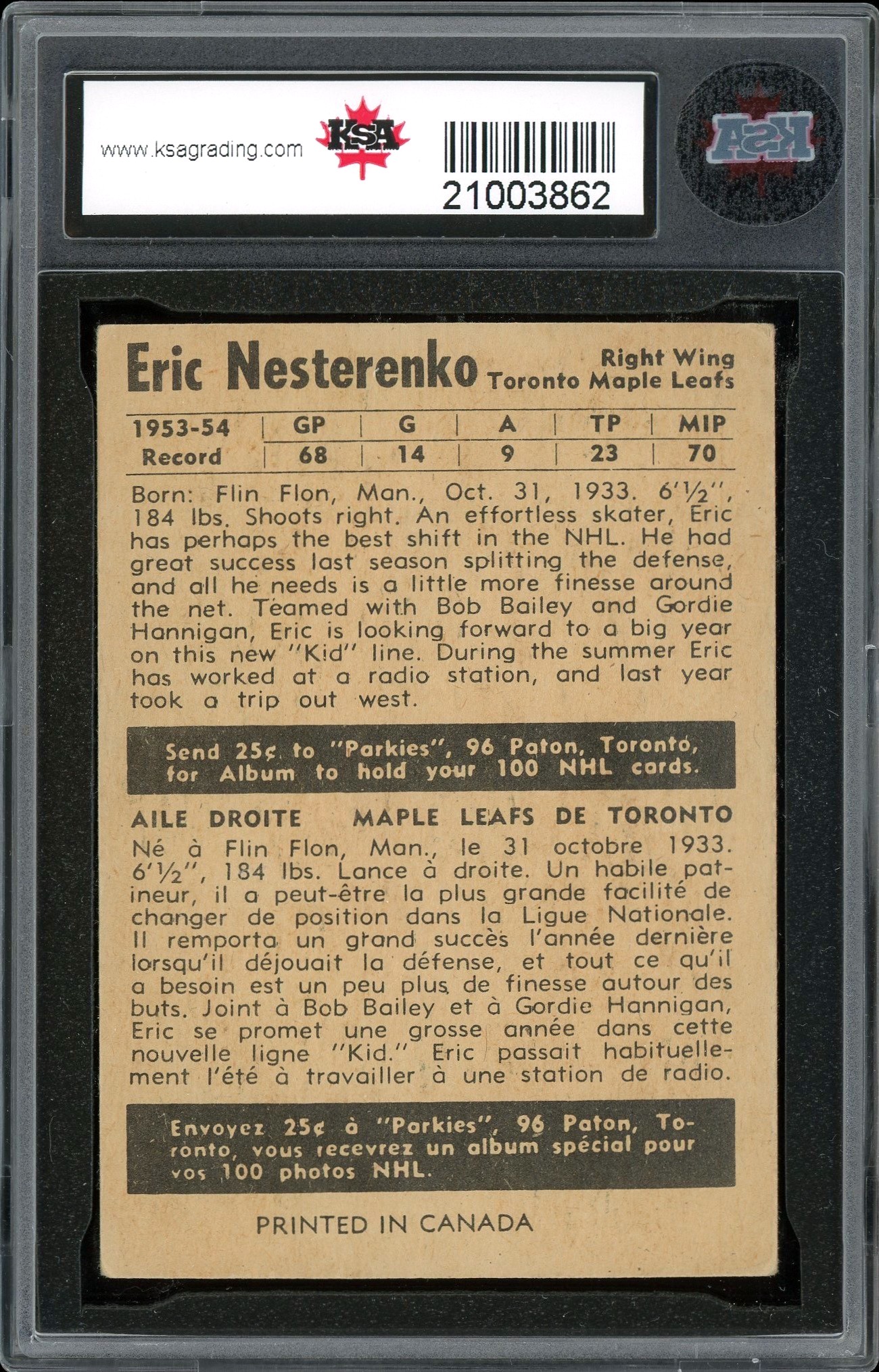 1953-54 Parkhurst #81 Gus Mortson (PSA 8)