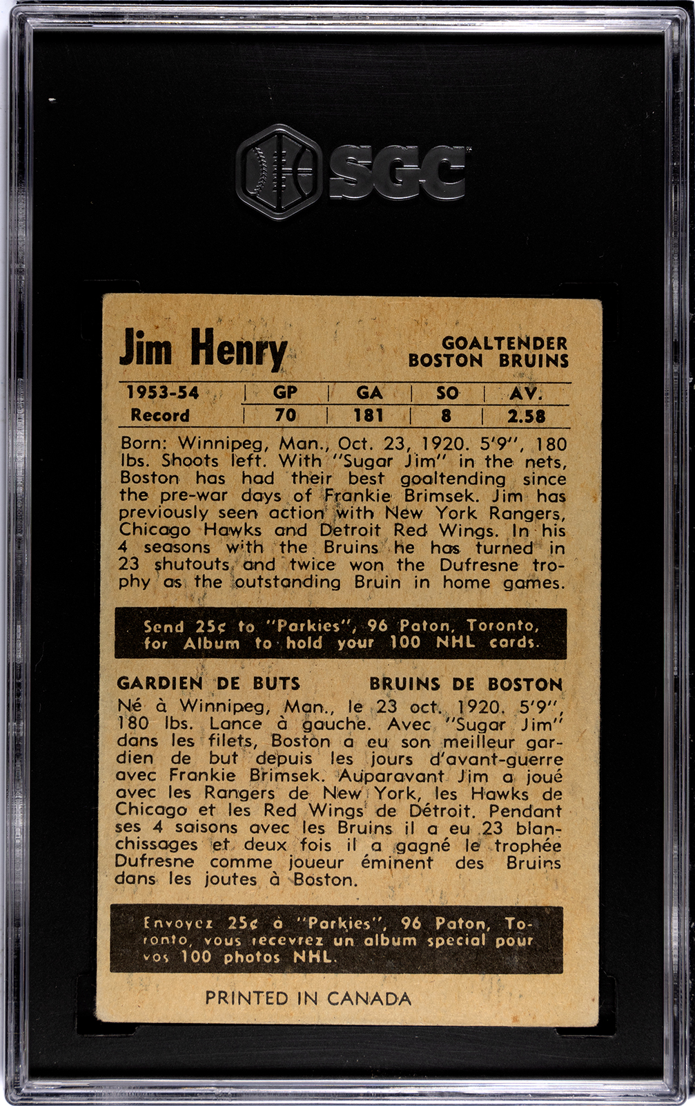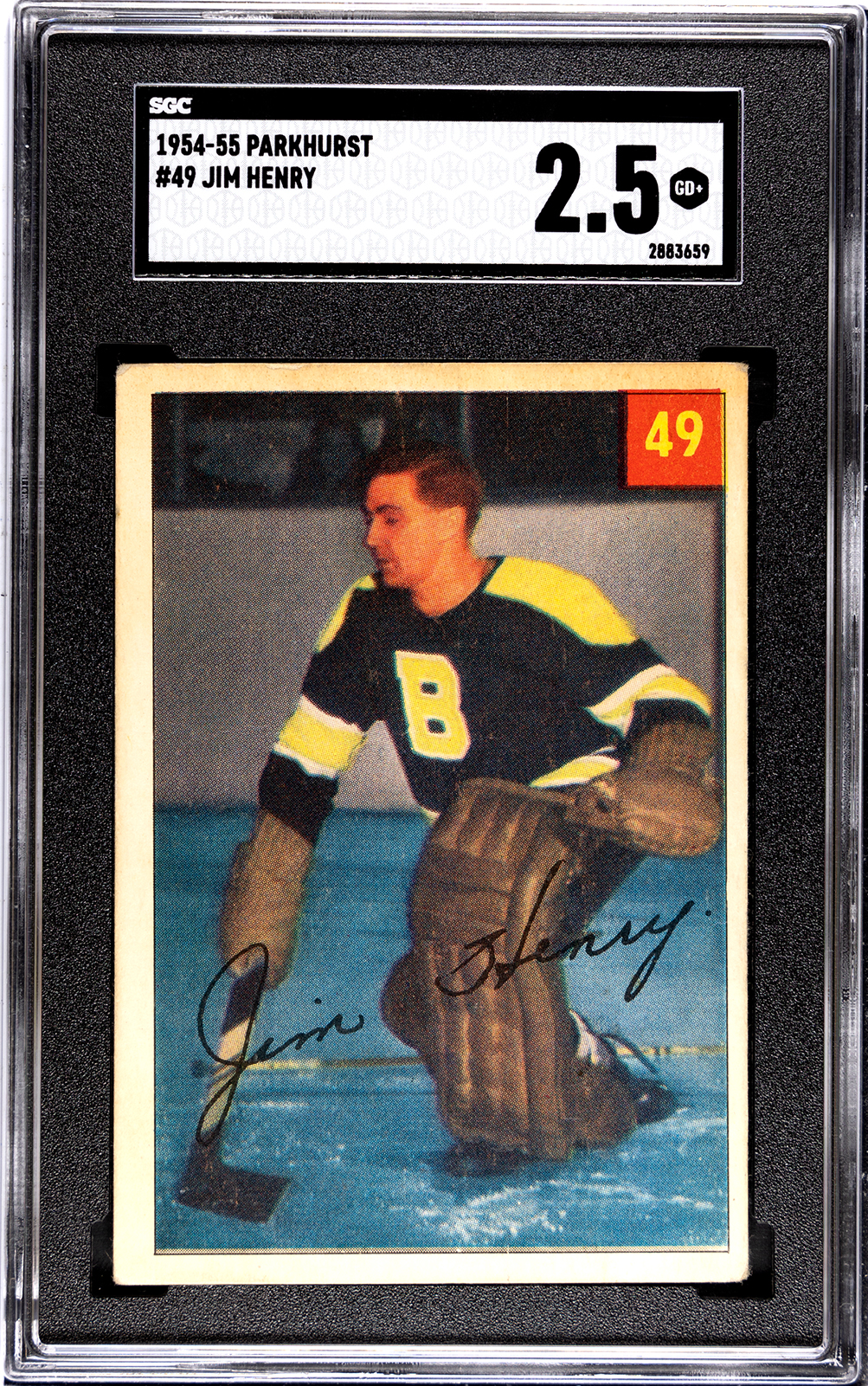 Off-grade and affordable card of Bruins goaltender, Sugar Jim Henry.