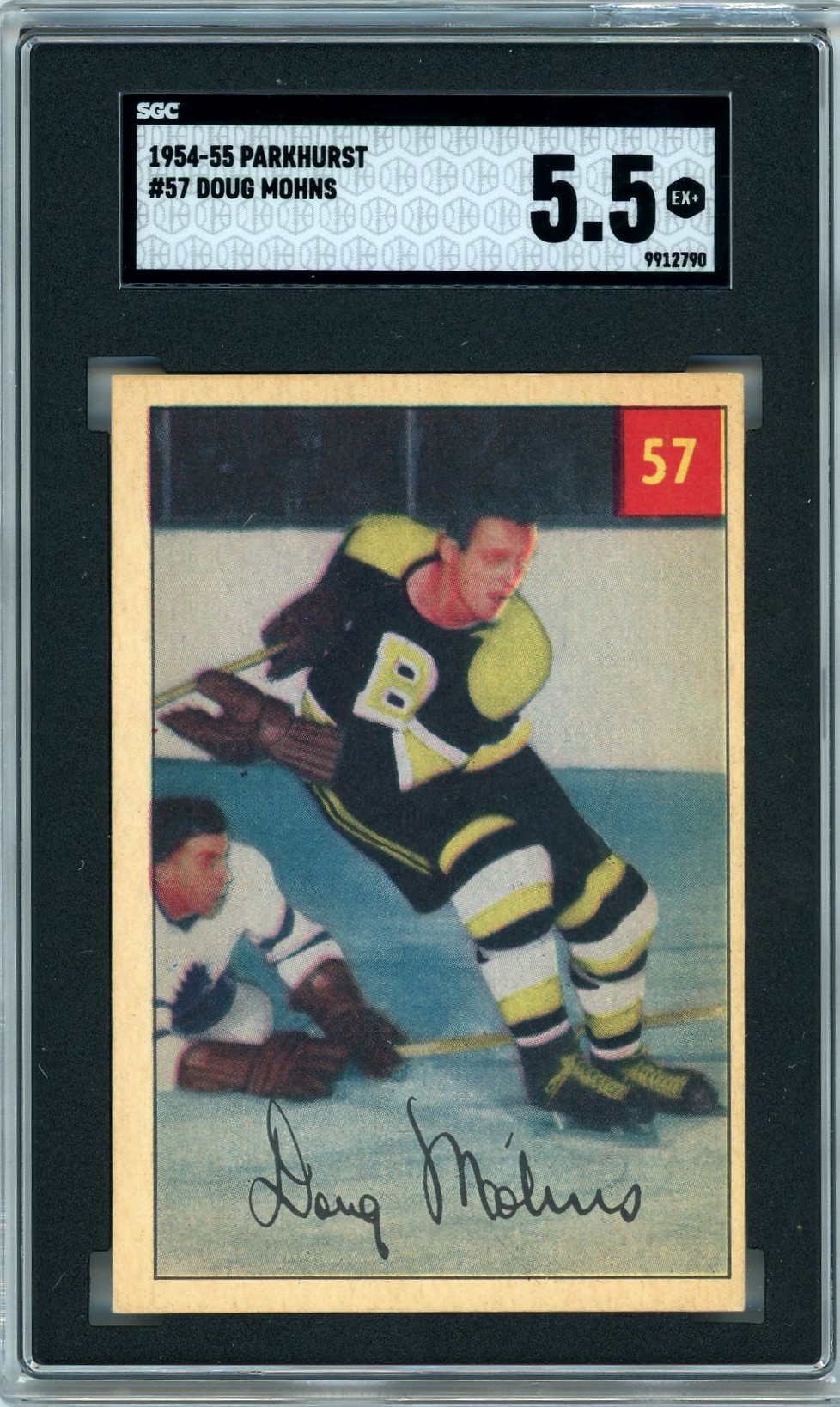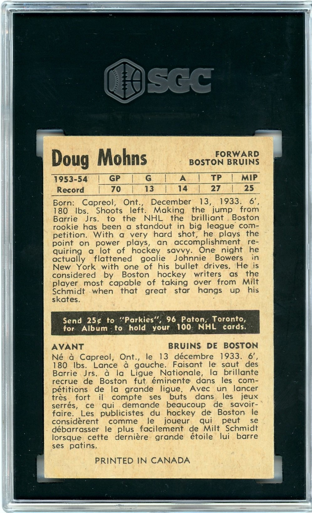 Nice rookie card of long-time NHLer, Doug Mohns, who broke in straight of out junior in 1953 and lasted until 1975, never spending a day in the minors. He played both defense and forward and played in six all-star games.