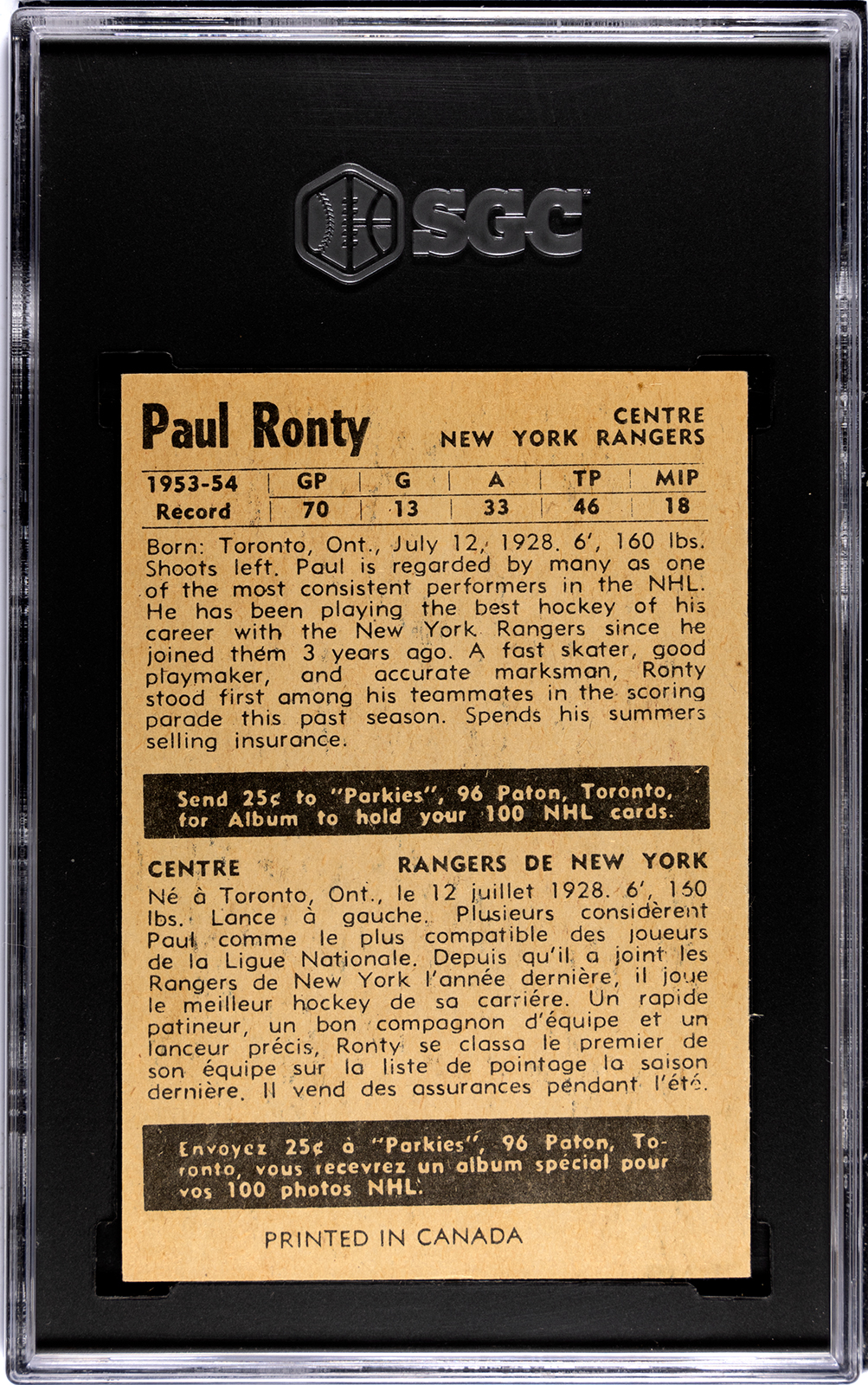 Clean card of the Ranger’s Paul Ronty, a solid NHLer who in his first full season would score 20 goals and 49 points in 60 games, finish third in the voting for the Lady Byng and fourth in the voting for league MVP.
