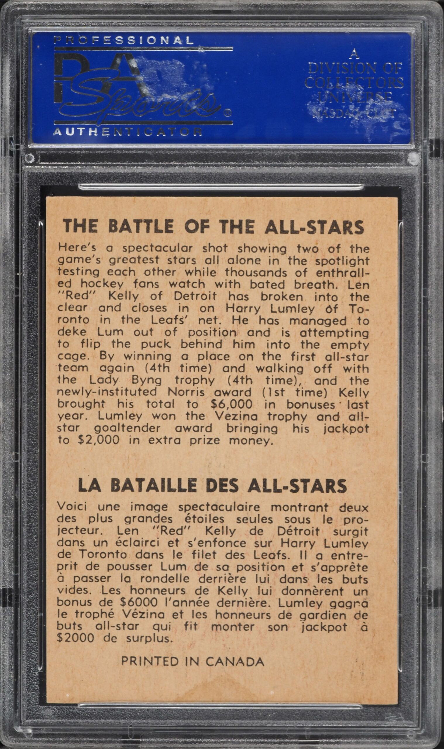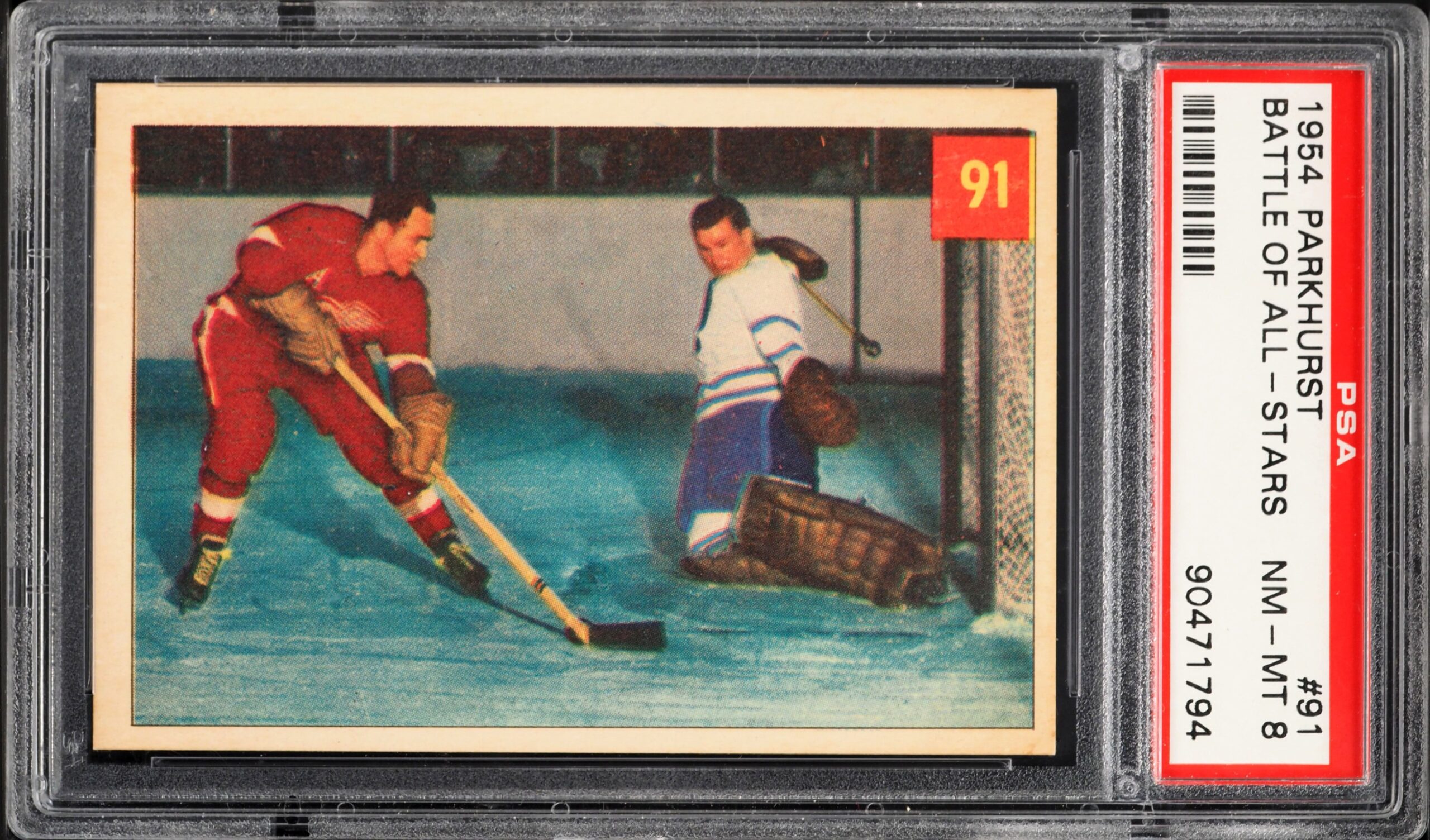 Super clean high-grade action card with dueling HOFers, Red Kelly and Harry Lumley. Of the 117 graded by PSA, only 4 grade higher.