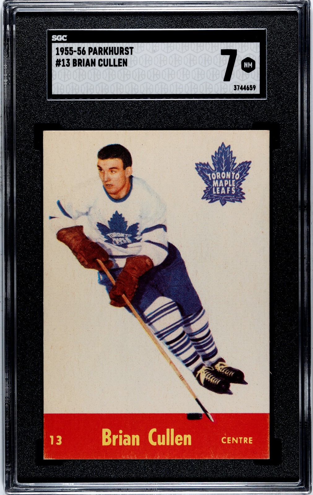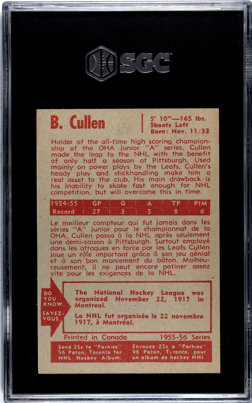 Nice high grade Cullen rookie card. Cullen had a brief career in which was the OHA’s MVP (161 points in 59 games!) in 1954 before graduating to the NHL. By 1963 he was out of pro hockey and into a car dealership, which still stands today in St. Catharines, Ontario.