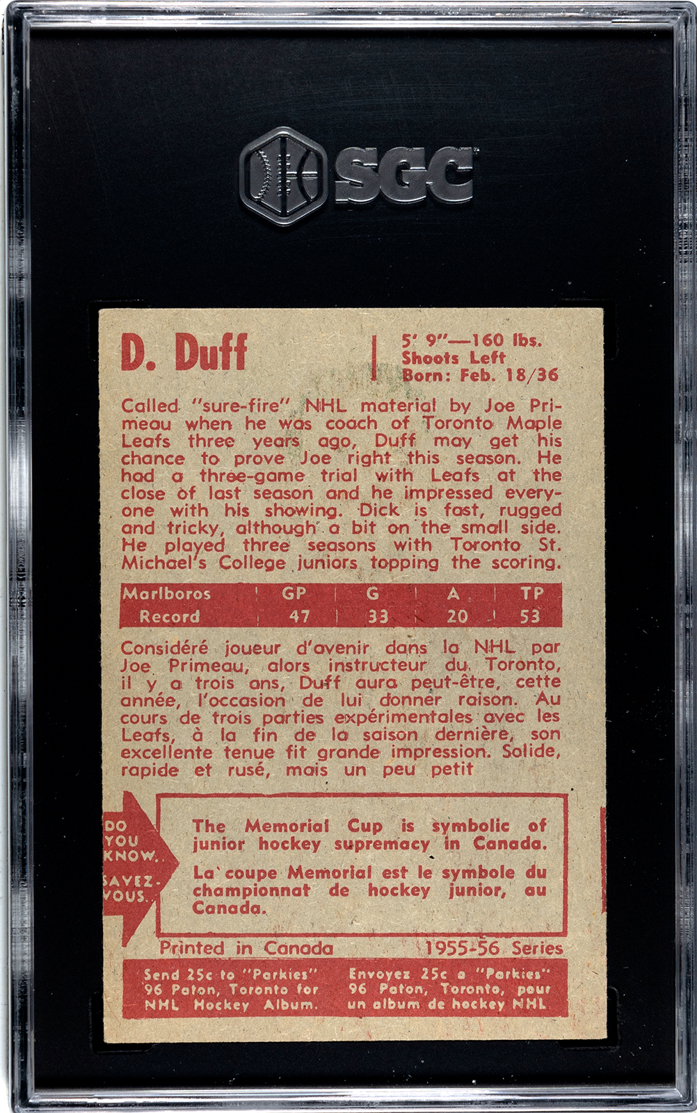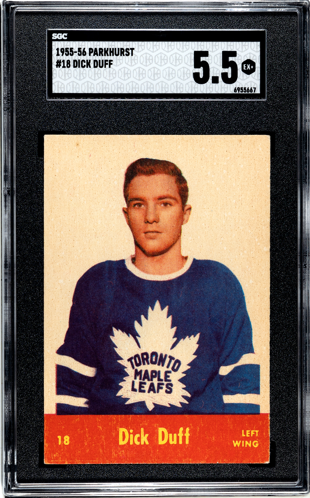 Popular rookie card of HOFer Dick Duff, who played 18 NHL seasons and won six Stanley Cups, two with Toronto and four more with Montreal.