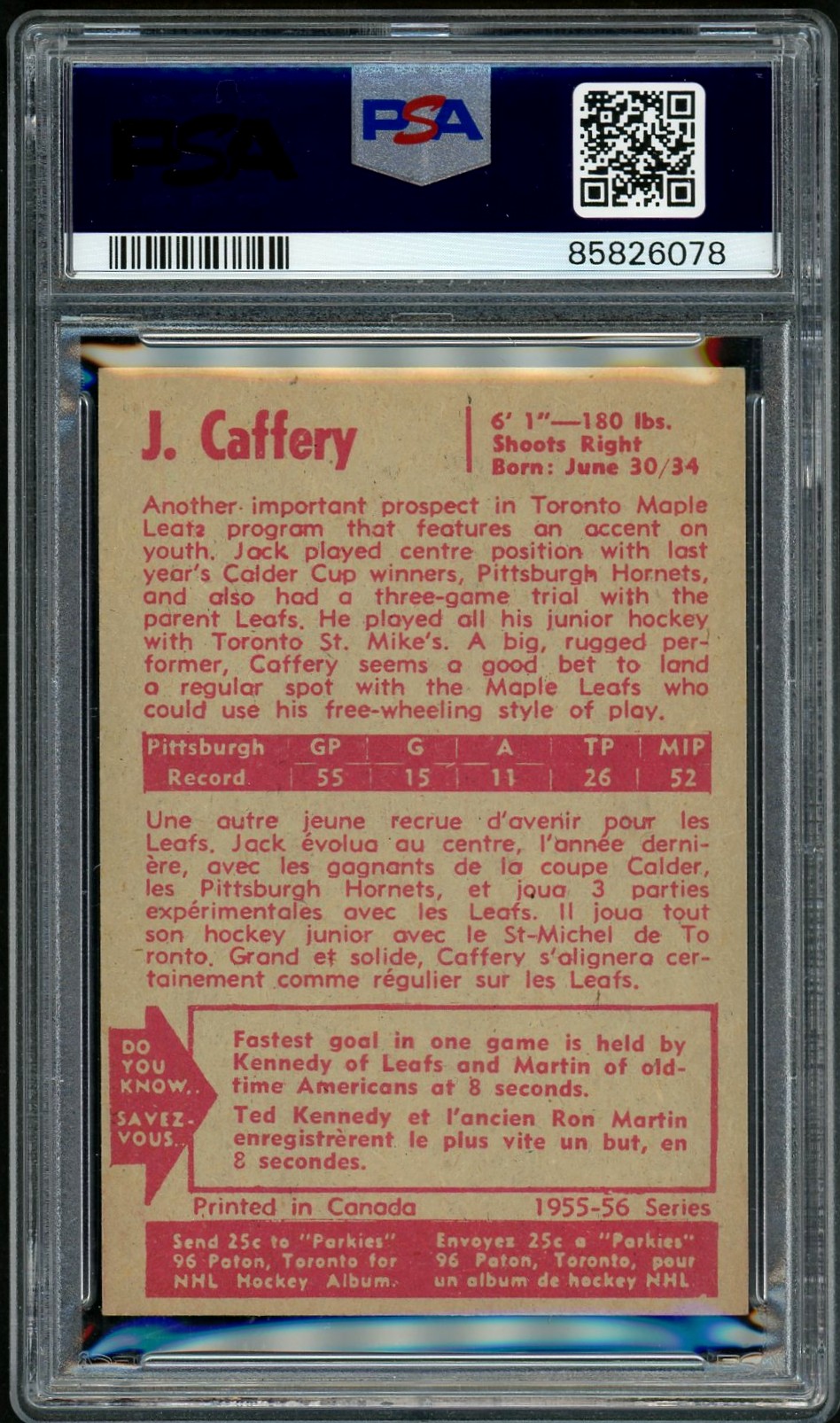Be the first to review “1955-56 Parkhurst #19 Jack Caffery RC (PSA 6)”