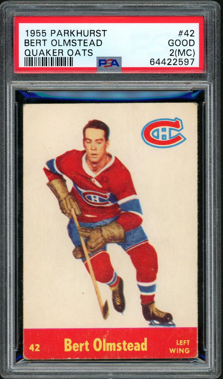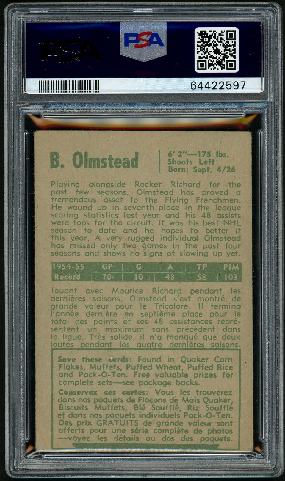 Lower grade example of HOFer Bert Olmstead’s green back. The “mc” qualifier is seen on the back, along the bottom.