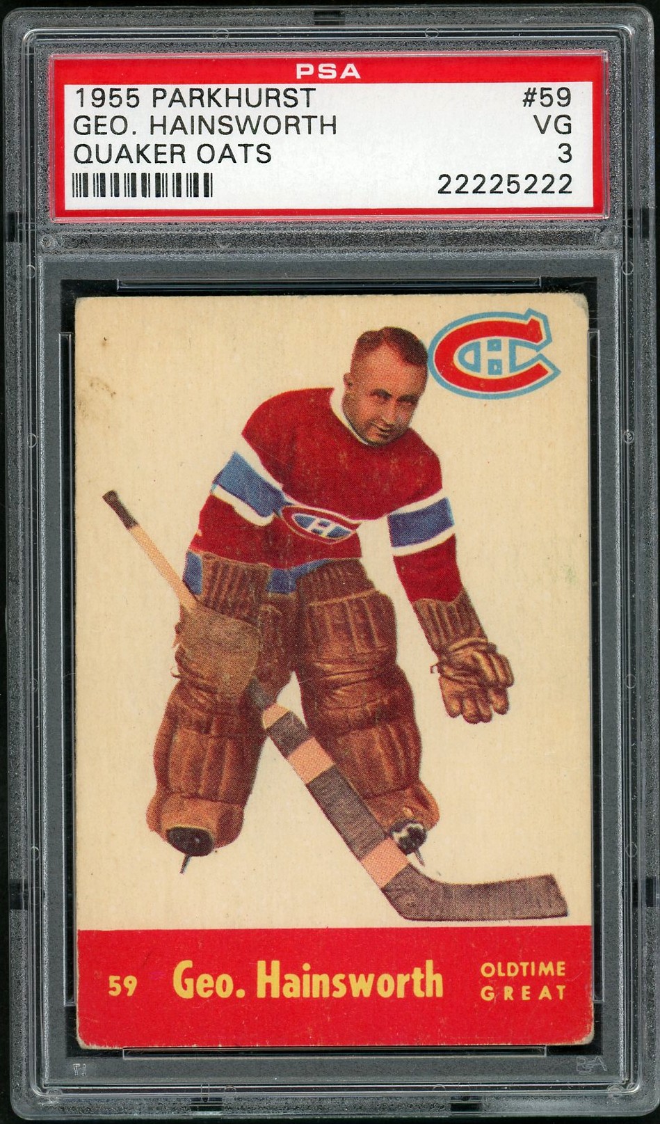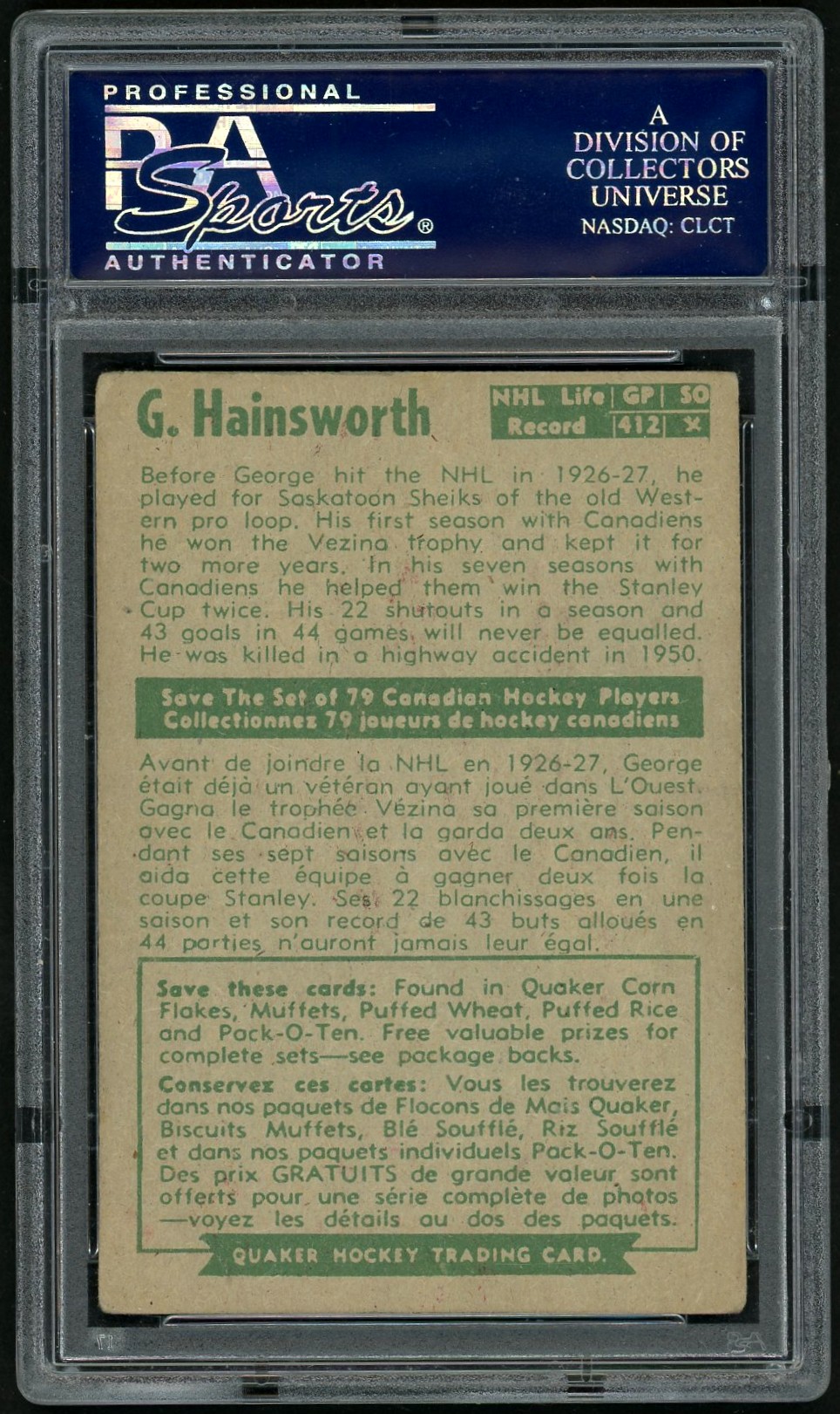 Quaker Oats: Parkhurst made this mirror set for food company Quaker Oats which included the hockey cards as a premium in a variety of their products. They are the same as regular Parkies on the front, but the backs feature green ink (regular Parkies had red ink) and included the details of the Quaker contest. There is no mention of Parkhurst. Since the set was meant to be collected in its entirety and exchanged for “valuable prizes”, a few high-profile cards were notoriously short printed (Harry Lumley, Maurice Richard and King Clancy) to rig it so very few prizes were ever awarded.
