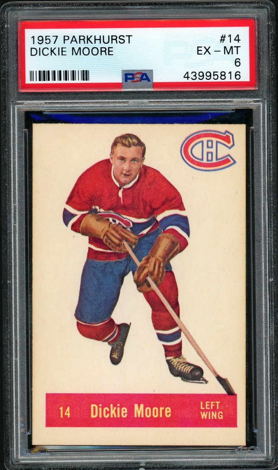 Sharp card of HOFer Dickie Moore, a two-time scoring champ and six-time Stanley Cup winner, from a tough set!