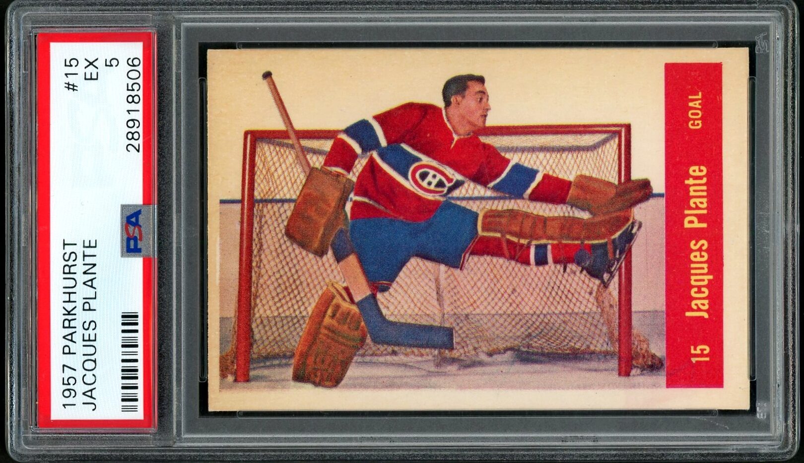 Gorgeous 2nd-year card of all-time great goaltender, HOFer Jacques Plante. Consider seven Vezina Trophies, six Stanley Cups, league MVP, seven-time all-star (three first-team), and that he led the league in GGA 8x, wins 5x, shutouts 4x, save % 5x, playoff wins 5x, playoff GAA 7x, playoff save % 5x, and playoff shutouts 6x. One of the all-time best goalie poses as well!