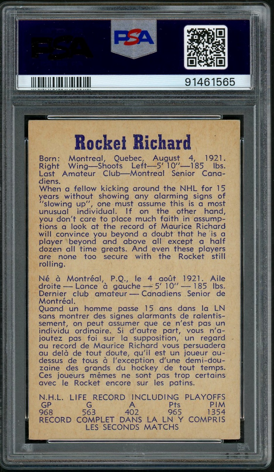 Superb mid-grade card of the great HOFer, Maurice “Rocket” Richard, one of hockey’s all-time greats. Rocket led the Canadiens to eight Stanley Cups, leading in playoff goals five times. He scored 82 goals in the playoffs, 18 of them game-winners. He was a 14-time all-star which includes eight first-team selections. He was the first player to score 50 goals (in 50 games no less) and the first to score 500. He scored 20 or more goals in 14 consecutive seasons, nine of those with 30 or more. He played with intensity and was the idol of millions. One of the all-time greats.