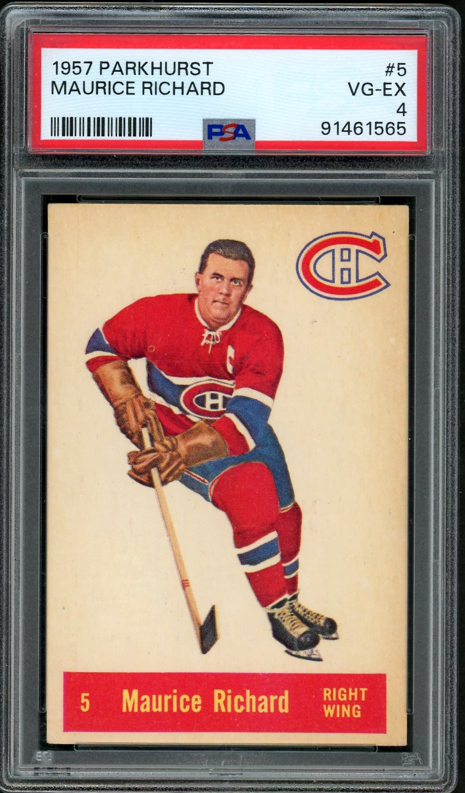 Superb mid-grade card of the great HOFer, Maurice “Rocket” Richard, one of hockey’s all-time greats. Rocket led the Canadiens to eight Stanley Cups, leading in playoff goals five times. He scored 82 goals in the playoffs, 18 of them game-winners. He was a 14-time all-star which includes eight first-team selections. He was the first player to score 50 goals (in 50 games no less) and the first to score 500. He scored 20 or more goals in 14 consecutive seasons, nine of those with 30 or more. He played with intensity and was the idol of millions. One of the all-time greats.