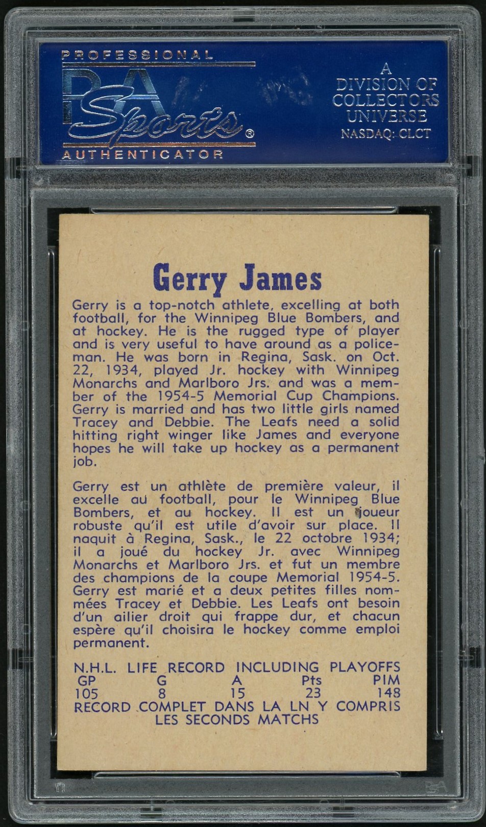Rookie card of Gerry James, who was also at this time playing professional football in the Canadian Football League, where he would become a Hall of Famer. James played both pro hockey and football for a number of years, one of the few athletes to compete professionally, at the same time, in multiple sports.
