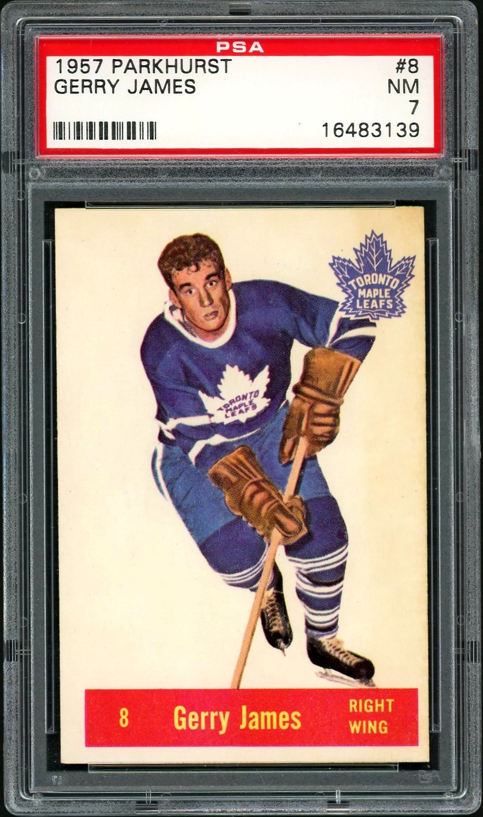 Rookie card of Gerry James, who was also at this time playing professional football in the Canadian Football League, where he would become a Hall of Famer. James played both pro hockey and football for a number of years, one of the few athletes to compete professionally, at the same time, in multiple sports.
