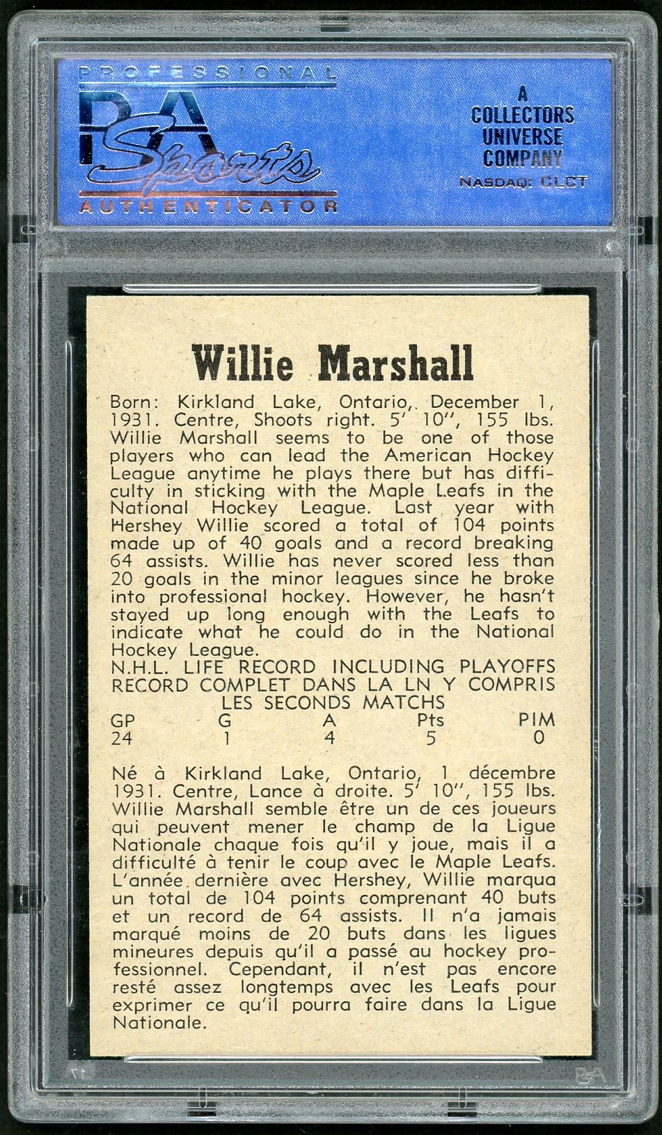 Nice high-grade example of all-time AHL scoring leader, Willie Marshall.