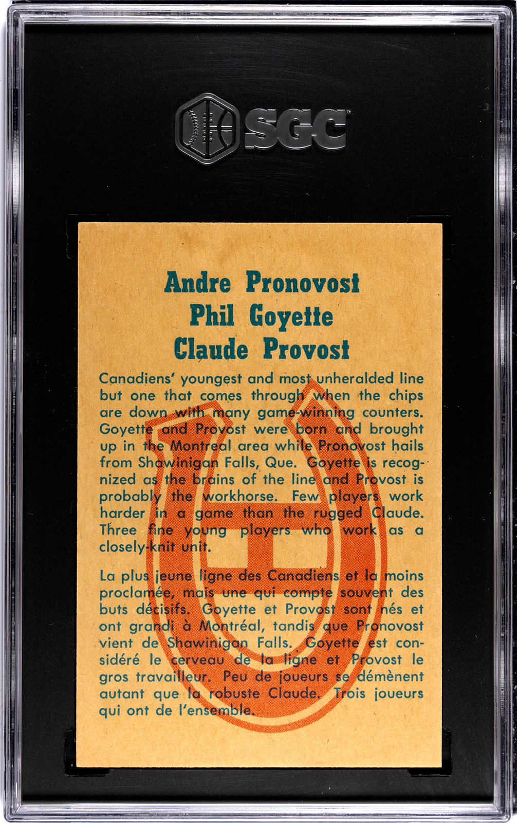 Ultra high-grade card featuring Montreal’s highly efficient checking line of Claude Provost, Phil Goyette, and Andre Pronovost.  This is the highest graded example graded by SGC.