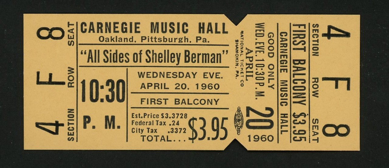 Unused ticket from a performance by comedian and actor, Shelley Berman, in Pittsburgh, April 20, 1960. Berman was a highly successful comedian who had several of his albums achieve Gold status, and who in 1959 won the first Grammy award for spoken comedy. In his later years he would play Larry David’s father on “Curb Your Enthusiasm” (2002 to 2009).