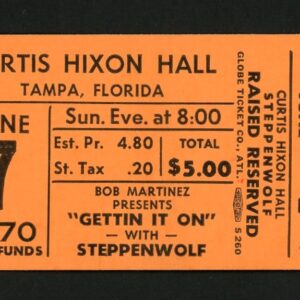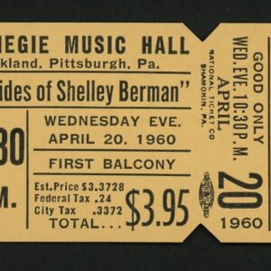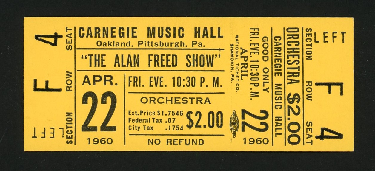 Unused ticket from the Alan Freed Show at the Carnegie Music Hall in Pittsburgh, Pennsylvania, April 22, 1960. Freed was the first “rock n’ roll” DJ, parlaying his gig into a live event touring machine which featured multiple acts, back-to-back, on the same stage. Some the biggest names in popular music participated in these often-frantic tours with this particular tour showcasing Freddy “Boom Boom” Cannon, among others. It’s interesting to note as well at this time that Freed was in a legal battle over the famous “Payola” scandal, and just weeks after this concert he and six other DJs were charged with taking bribes (pay for play) to give certain acts plenty airtime. He was also controversial for the fact he tirelessly promoted black performers at a time when racial segregation was rampant in the south.