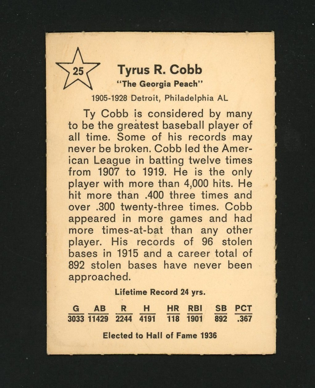 Issued in 1961, this set features all-time great Hall of Famers. Here we have one of the greatest, Ty Cobb. Clean card, crease free, some wear around edges, common with the perforations. The set came in a booklet with all the cards attached.