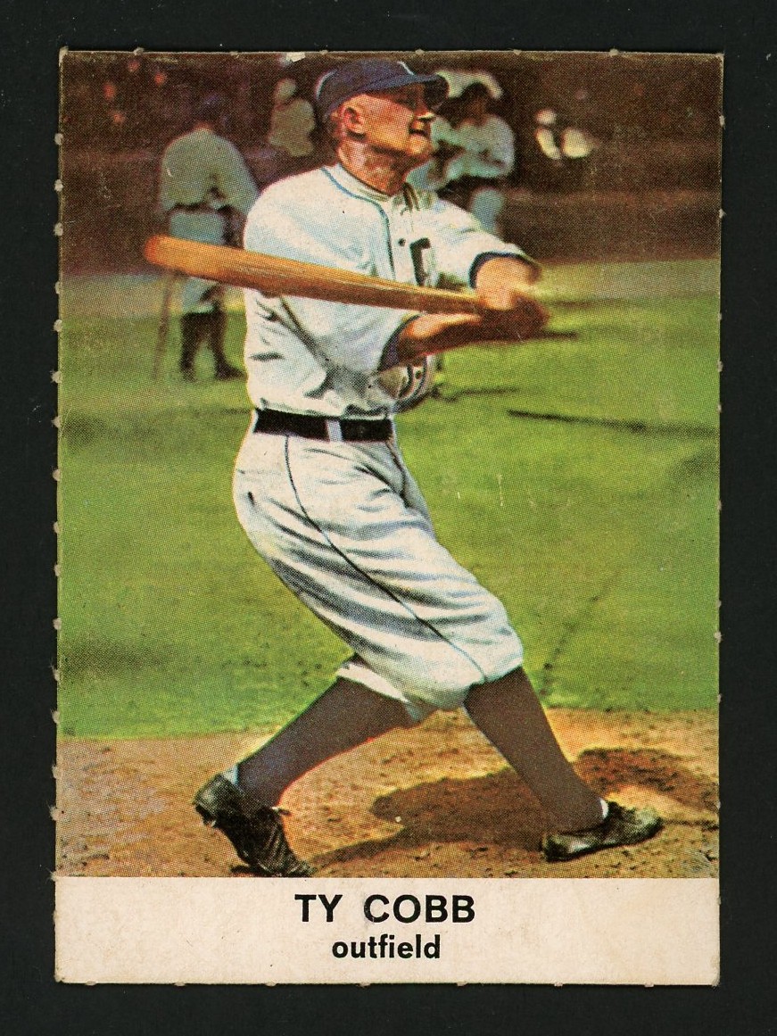 Issued in 1961, this set features all-time great Hall of Famers. Here we have one of the greatest, Ty Cobb. Clean card, crease free, some wear around edges, common with the perforations. The set came in a booklet with all the cards attached.